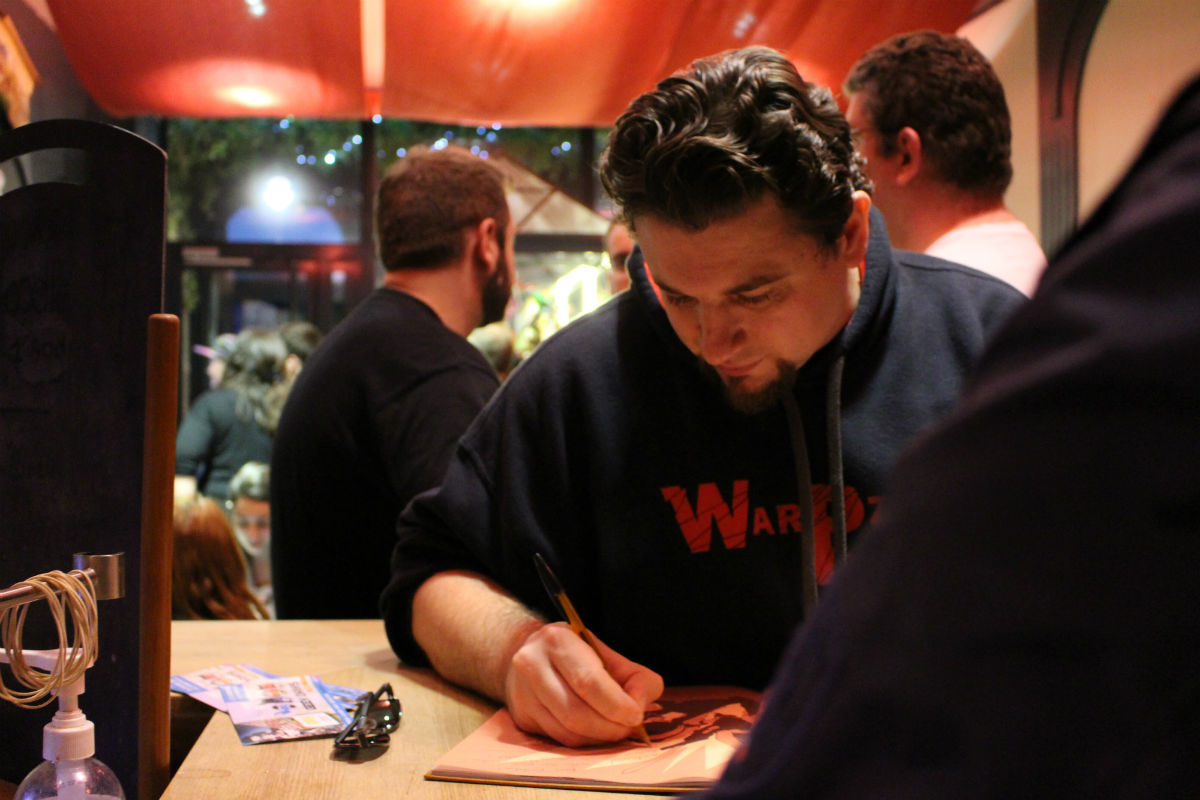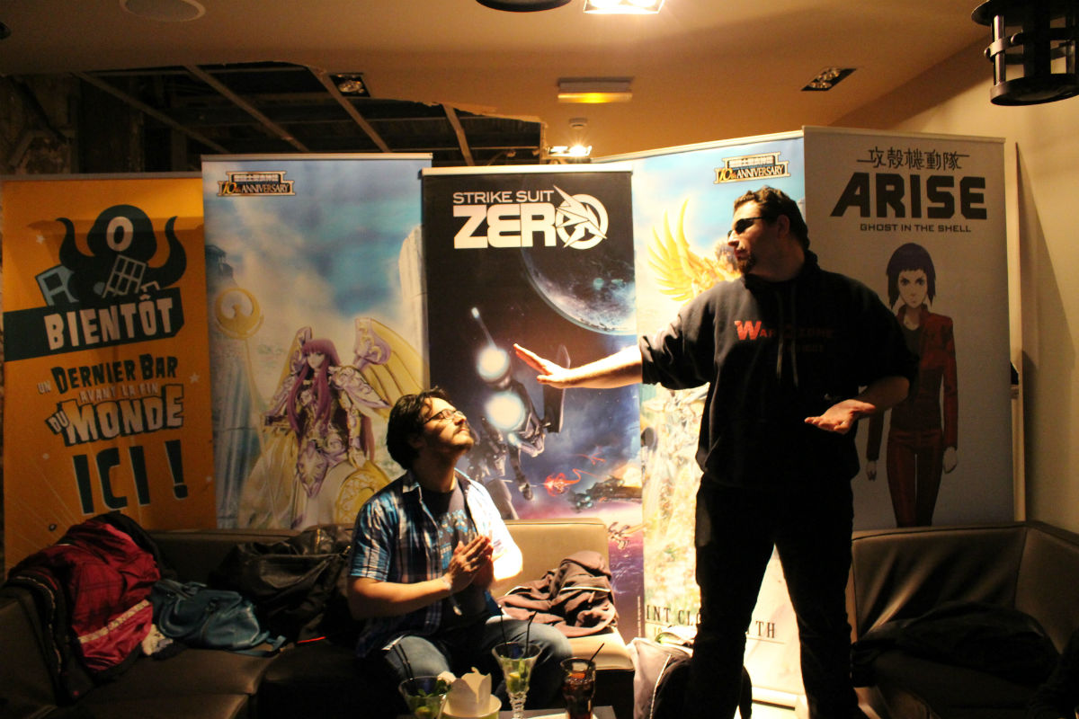 Il était près de 20h30 quand ceux-ci sont sortis de espace VIP pour se mêler aux diverses tables. Pas question de faire comme lors de la venue de Bruce Benamran (e-penser) où les fans avaient dû faire la queue pour le rencontrer à tour de rôle. C’est aux invités de naviguer de table en table ou au comptoir et de taper la discute. Sans leurs costumes ils deviennent même difficiles à reconnaître, dispersés ainsi au milieu de tout ce monde. Ils ont l’air tellement… normaux. Fabien Fournier, le réalisateur (qui joue également le rôle de Fantöm) est installé au comptoir, à croire qu’il n’a pas eu le temps d’aller beaucoup plus loin avant d’être interpellé. Il n’en bougera d’ailleurs pas beaucoup.