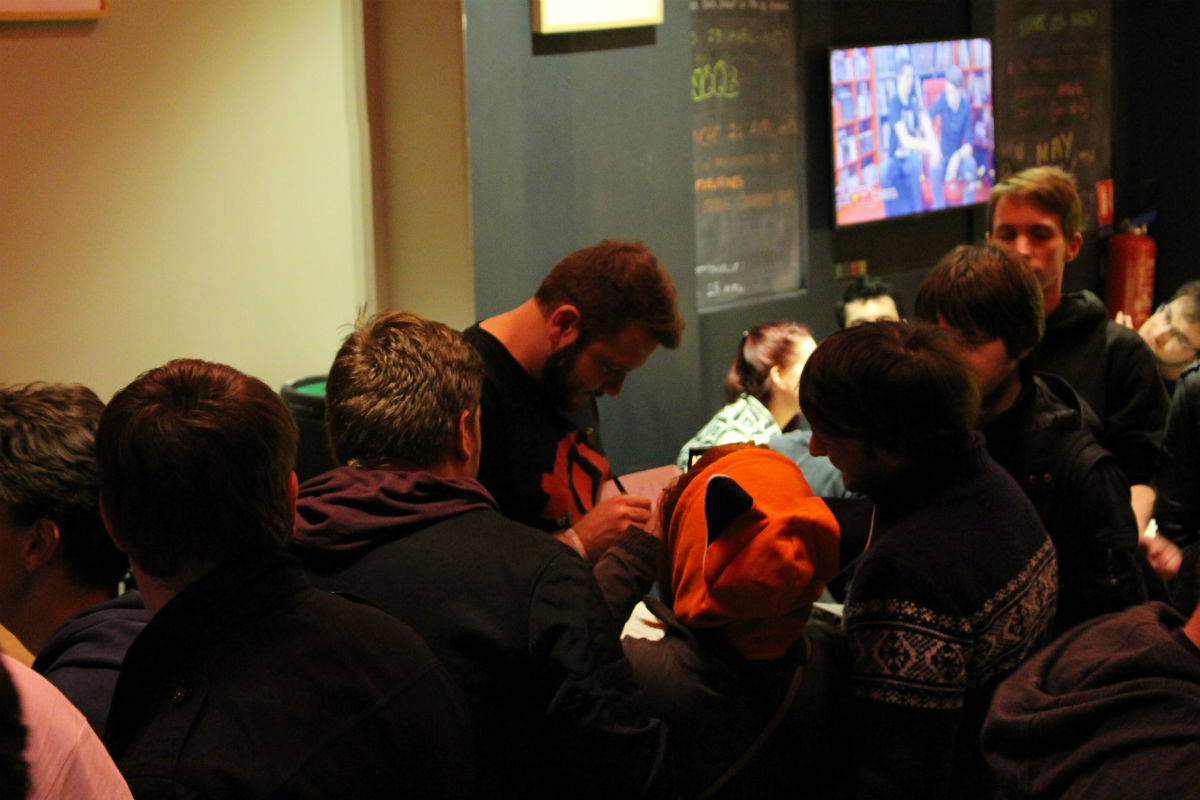 Les autres baladent à droite à gauche entre photographies, discussions et autographes, ne s’asseyant pas vraiment aux tables mais prenant le temps de parler avec tous ceux qui viennent vers eux. Alors qu’en début de soirée tout le monde était assis, il devient maintenant beaucoup plus compliqué de circuler, les gens s’étant levés pour rencontrer les acteurs. Le bar semble s’être encore plus rempli et les conversations couvrent très largement la musique. On ne peut pas dire que l’atmosphère soit calme, mais elle est loin d’être aussi survoltée que dans la queue à un stand de convention. C’est une sorte de calme après la tempête. Et c’est presque en catimini que Philippe (Bartémilius), Florence (Nostaria) et P.-A. (Tensirock) partent vers 22h30, tandis que Fabien, Anne-Laure et Mathieu (Ystos) restent encore un peu, pour être sûr de voir tout le monde.