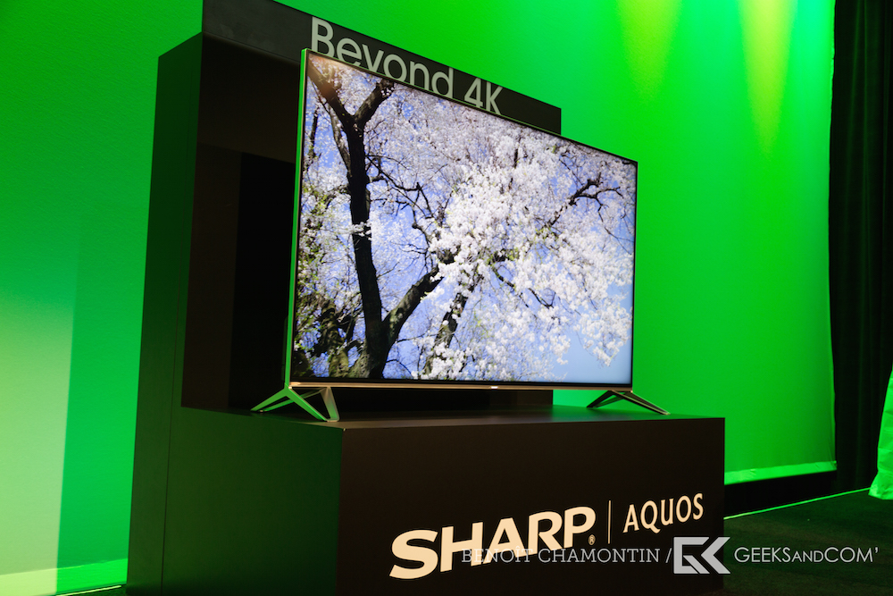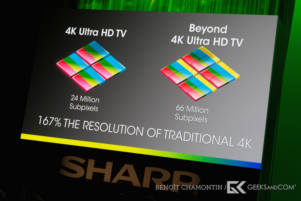 Pour ceux qui ne se satisferaient pas de la 4K, Sharp offre son téléviseur « Beyond 4K Ultra HD ». Concrètement, Sharp utilise sa technologie Quattron dont nous avions parlé l’année dernière sur son écran 4K haut de gamme. Cela permet ainsi d’obtenir une résolution de 66 millions de sous pixels, contre 24 millions sur un écran 4K classique, ce qui représente une résolution 167% supérieure. Le téléviseur sera disponible en 80″.