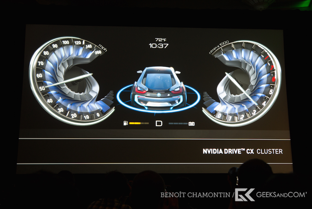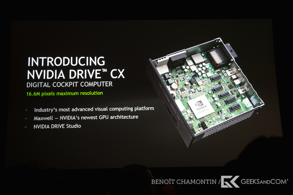 Les automobiles nécessitant de plus en plus de puissance de calcul afin d’alimenter les différents écrans du cockpit, Nvidia propose une solution intégrée par le biais du Tegra Drive CX, un mini ordinateur de bord. Ce dernier est capable de gérer 16.6 Megapixels de résolution maximale, correspondant ainsi à 4 écrans en résolution Full HD. Il est bien évidemment propulsé par la puce Maxwell du manufacturier.