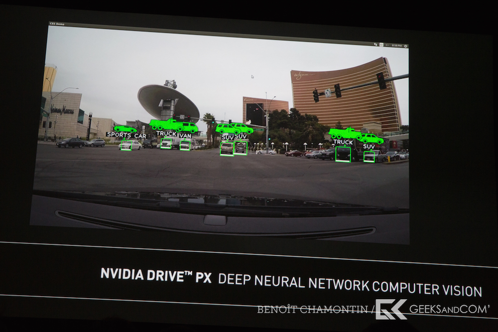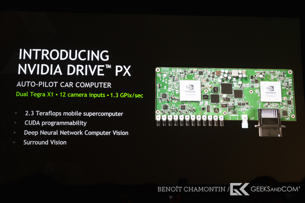 Le Nvidia Drive PX, incluant deux processeurs Tegra X1, est capable de produire une puissance de calcul de 2,3 teraflops et gérer 1,3 milliards de pixels par seconde, est la réponse au besoin d’analyse de ces différents flux vidéo reçus par le véhicule. Cette puissance de calcul permet de détecter un grand nombre d’éléments du décor et de les comparer avec une base de données connues. Un piéton sera par exemple identifié, un panneau de circulation ou un cycliste également. Il s’agit par exemple de la même technologie utilisée par les réseaux sociaux pour identifier les personnes présentes dans les photos.