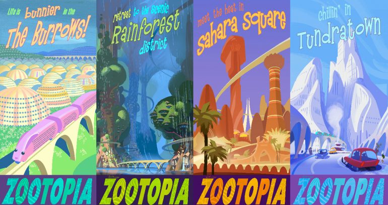 Tout d’abord, à l’extérieur de Zootopia, les terres agricoles qui sont pour ceux qui cultivent la terre comme les lapins, la ville se nomme BunnyBurrow. Ensuite, nous avons le secteur Sahara Square, c’est l’endroit où vivent les animaux qui ont besoin de chaleur. Puis, on se dirige vers Tundratown, qui est un secteur très enneigé où les animaux vivent dans le froid comme les ours polaires, les manchots et plus. Par la suite, il y a Little Rodentia, petit quartier mais débordant et réservé aux tout petits animaux. Près de cette mini ville, nous avons le secteur où la pluie est présente tous les jours, Rainforest.