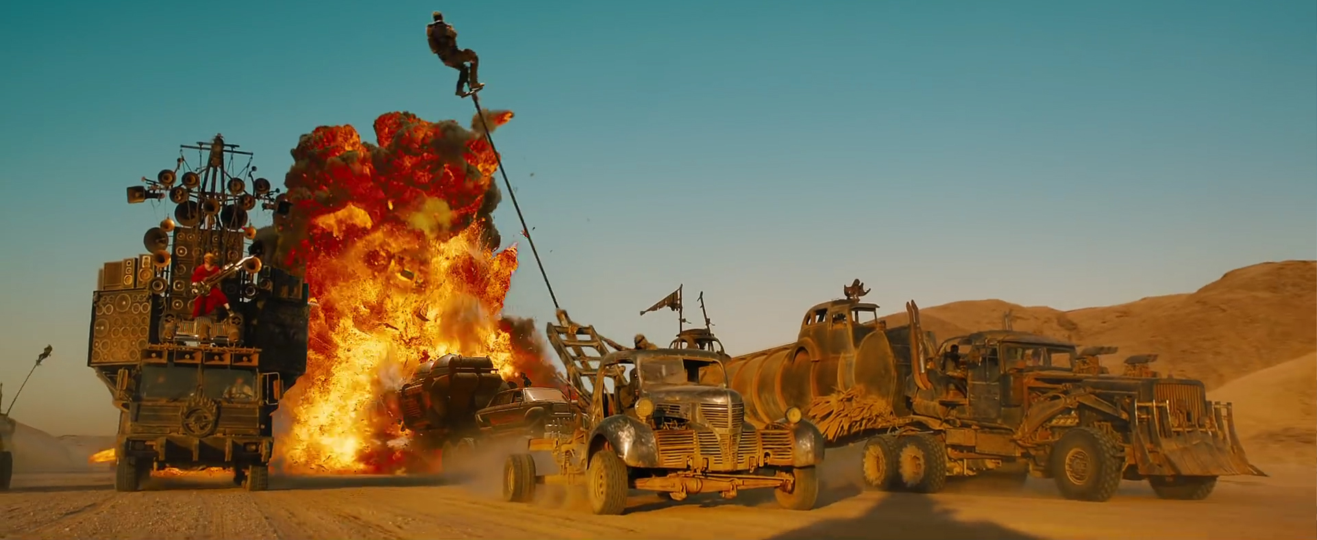 Maintenant si vous n’avez pas vu les anciens films Mad Max comme moi, sachez que tout le monde dans ce film est fou, au point qu’un homme joue avec une guitare-lance-flammes accroché à un véhicule pendant tout le film, c’est de l’action pure et dure non stop pendant 2h et toujours en mouvement du fait qu’ils sont dans une course poursuite, ils réparent même les véhicules pendant qu’ils roulent. Il y a seulement quelques moments où ils s’arrêtent mais c’est pour repartir de plus belle ensuite. En fait j’ai l’impression d’avoir vu un film d’action des années 80 mais avec le budget et les moyens d’aujourd’hui, ce que je veux dire par la c’est que beaucoup des scènes sont réalisées grâce à des effets spéciaux « pratiques » et non des effets visuels. L’ensemble des véhicules (qui ont d’ailleurs le look de l’époque) ont vraiment été détruits lors du tournage, les explosions sont réelles et même la guitare lance flamme est vraiment fonctionnelle en vrai, tout ça donne un aspect crédible à l’action comparée à d’autres films qui essayent d’être trop “over the top”, Il y a quand même une grosse scène faite avec des effets visuels mais vous n’allez clairement pas regrettez de la voir tellement elle est impressionnante.