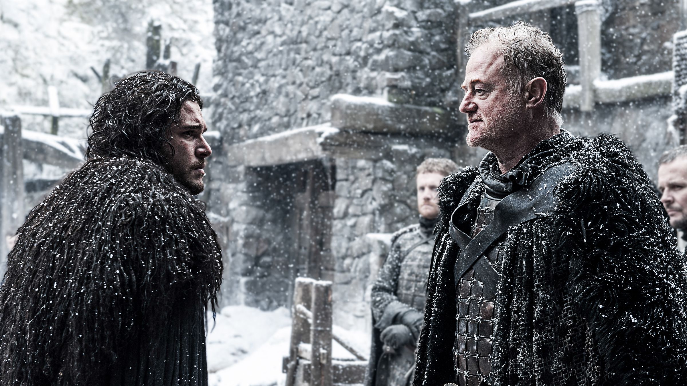 Jon Snow quitte le mur et part avec les sauvageons pour les sauver des marcheurs blancs. Sam en profite pour lui donner du verre-dragon, pour tuer les créatures volantes au cas où il en rencontrerait. Juste après le départ de Jon Snow, Aeron Targeryen meurt. Il meurt de vieillesse, je tenais à le souligner, car il semble que ça ne soit pas la cause de mortalité la plus haute dans Game Of Thrones. Sam et Gilly se retrouvent donc seuls, ce que le commandant temporaire, nommé par Jon Snow, n’oublie pas de lui souligner. Gilly manque de peu de se faire violer, Sam arrive à temps et engage un combat contre deux hommes de la garde de la nuit. Après avoir reçu de très lourds coups, le loup de Jon Snow arrive pour clôturer la lutte.