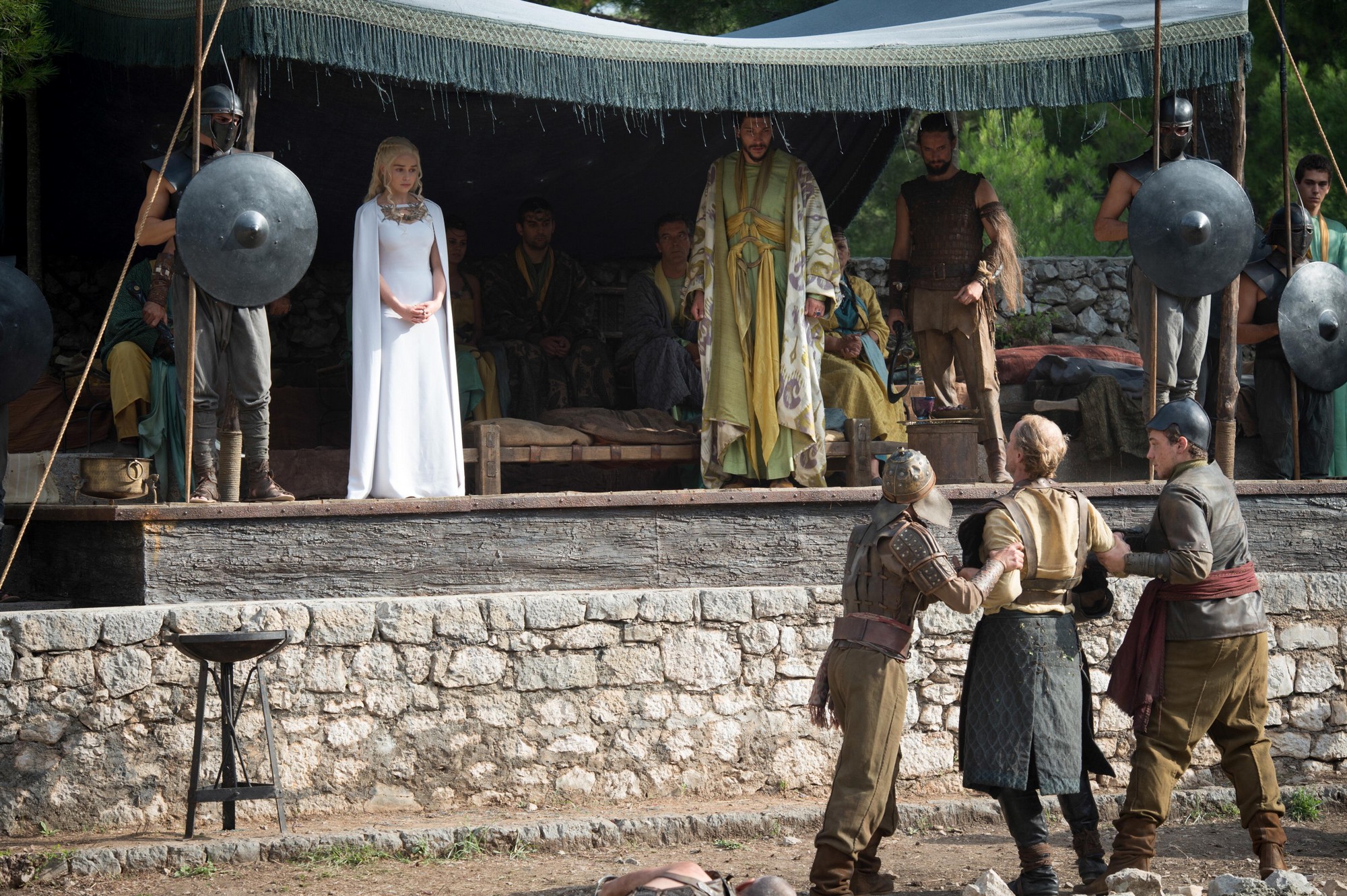 Une des traditions veut que le roi et la reine se rendent tous deux voir ces qualifications et comme une coïncidence n’est pas coutume dans l’univers de Game Of Thrones, Daenerys se rend précisément la ou se trouvent Jorah et Tyrion. Mais malheureusement, ils ne sont pas choisis pour affronter d’autres esclaves. Cependant lorsque Jorah entend que la Reine est présente, il fait en sorte de se rendre au combat et se débarrasse de ses adversaires. Vêtu d’un heaume pendant tout le combat, il le retire devant son ancienne reine. Khaleesi est stupéfaite dans un premier temps puis le dégout de la trahison se lit sur son visage. Elle ordonne de l’emmener loin d’elle. Mais Jorah se débat en criant qu’il lui a apporté un présent. Tyrion arrive clamant qu’il est ce présent. Khaleesi demande qui il est, ce à quoi le nain rétorque qu’il est Tyrion Lannister. La scène se finit sur le regard troublé de Daenerys.