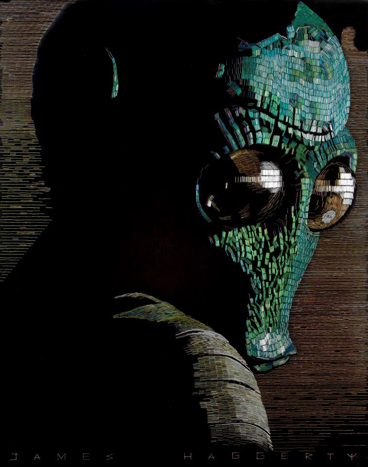Jusqu’à présent, James Haggerty a réalisé des portraits de trois personnages : Darth Vader (Dark Vador), C-3PO et Greedo. Si vous êtes moins familier avec Star Wars, Greedo est un personnage qui meurt dans l’épisode IV alors qu’il va au Mos Eisley Cantina pour récupérer la prime sur Han Solo. Cette scène fait partie de la fameuse controverse « Han shot first » (« Han a tiré le premier »). En effet, la scène a été modifiée entre la version originale de 1977 et la version remastérisée en 1997 faisant alors tirer Greedo en premier avant se faire tuer par Han Solo suscitant alors la réaction des fans face à ce choix de George Lucas.