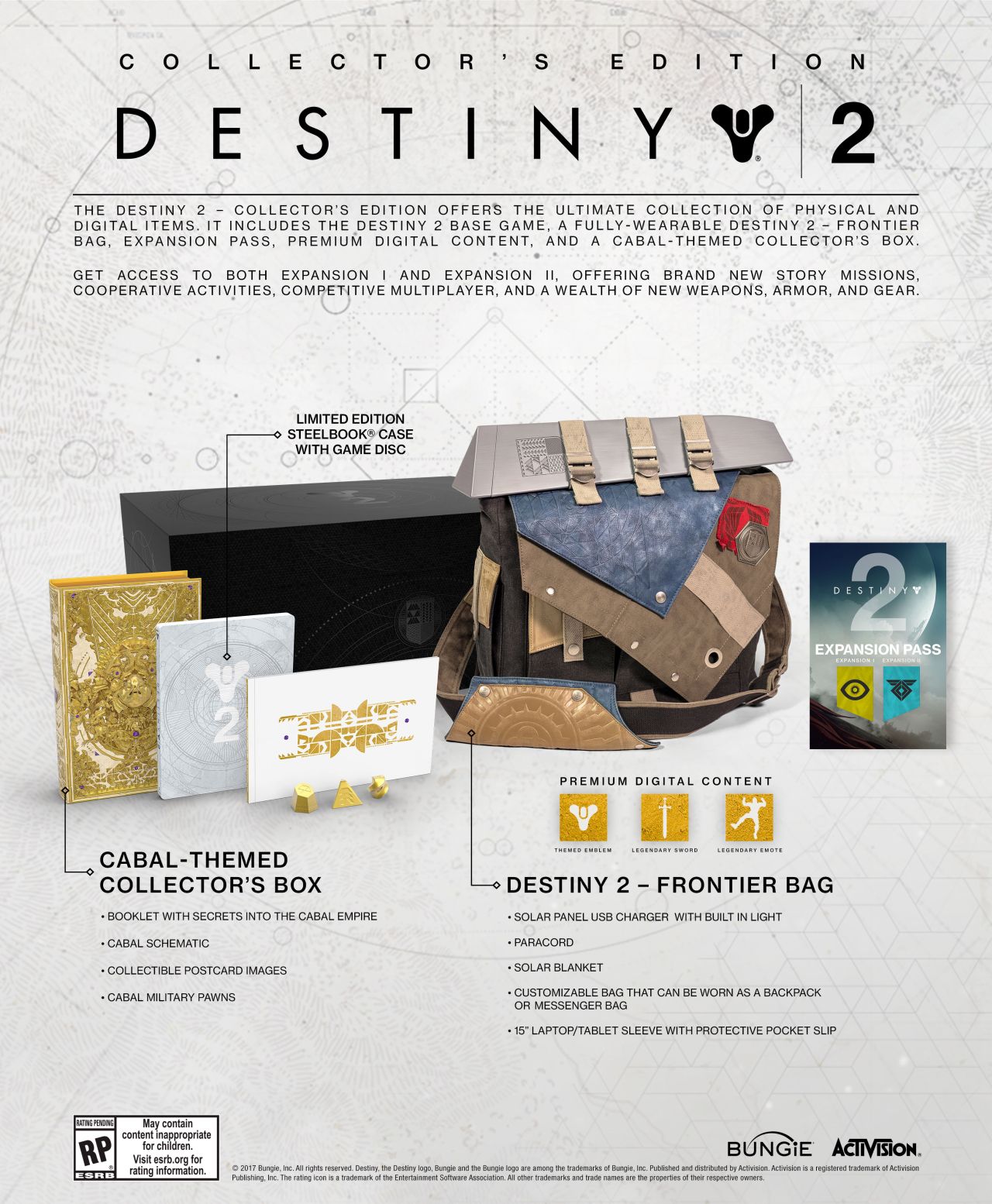 - Le Season Pass : donne accès à l’Extension I et l’Extension II, comprenant de nouvelles missions, des activités coopératives, du multijoueur compétitif et plein d’armes et pièces d’équipement.