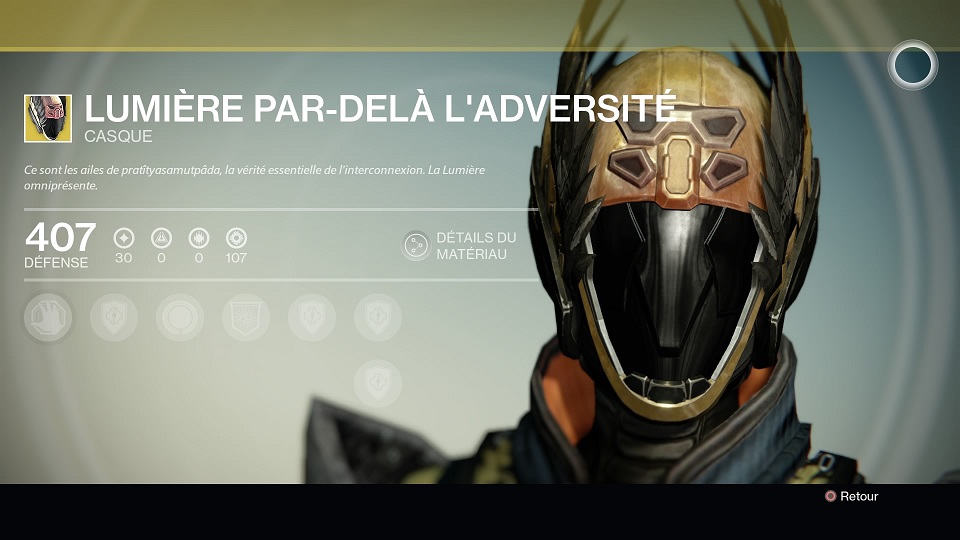 Pour sa première visite de la nouvelle année, Xûr nous offre une rareté en nous proposant la Lumière par-delà l’adversité. En plus d’être esthétiquement très beau et de vous permettre de réanimer et de vous faire réanimer plus rapidement, le casque permet aussi de générer un orbe supplémentaire lors de son activation. Le Monte Carlo, le Casque de la lumière intérieur et l’Échine du jeune Ahamkara font possiblement déjà parti de votre arsenal d’éxotique et si ce n’est pas le cas, je vous conseil tout de même de conserver vos précieuses pièces étrange pour une prochaine fois! Bonne semaine gardiens!
