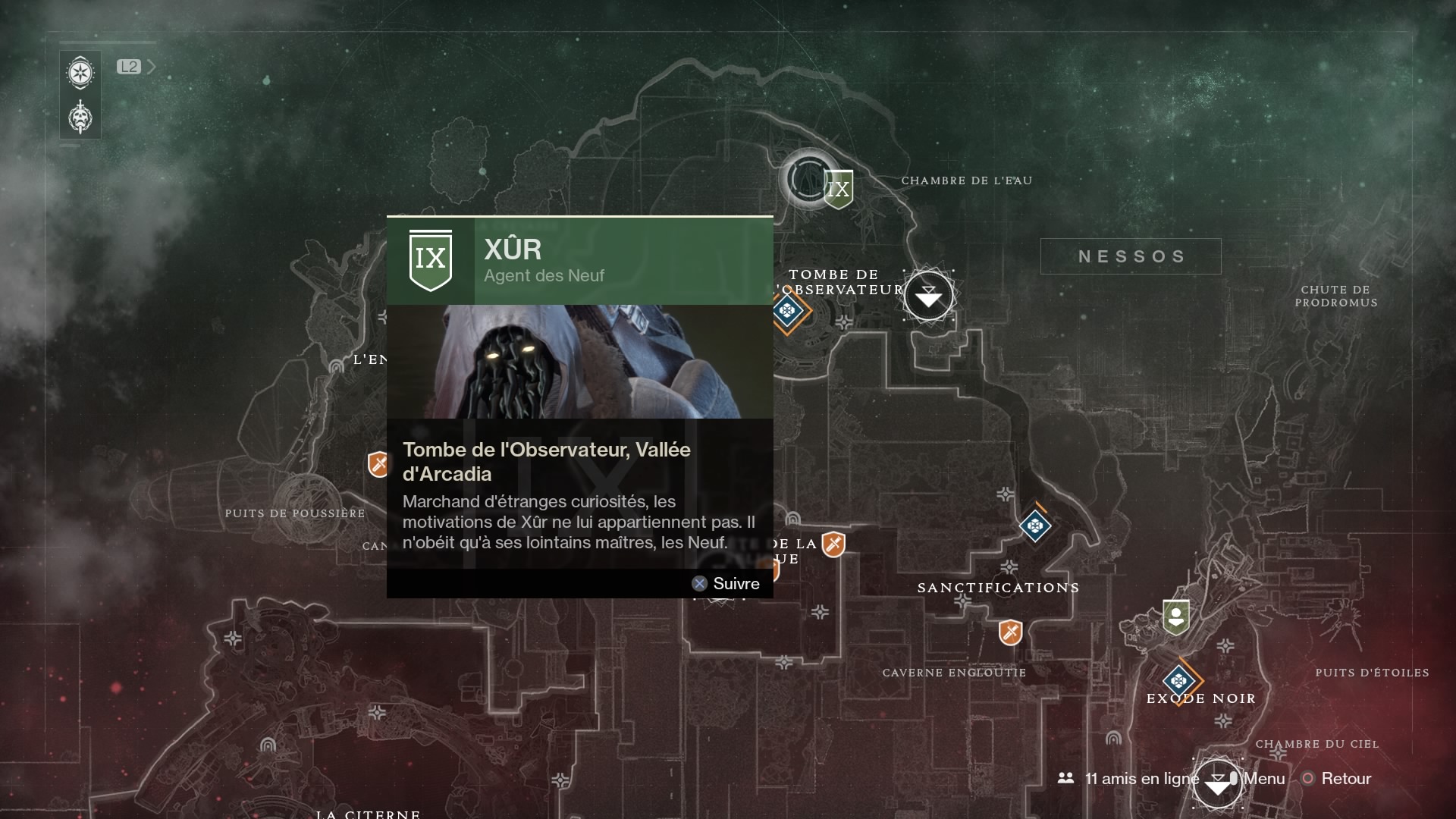 Nouveauté pour Destiny 2, ce dernier sera moins coquin dans sa discrétion puisque son emplacement sera indiqué sur votre carte. Pour ce week-end du 15 septembre 2017, Xûr se situe dans la section Nord de Nessos :
