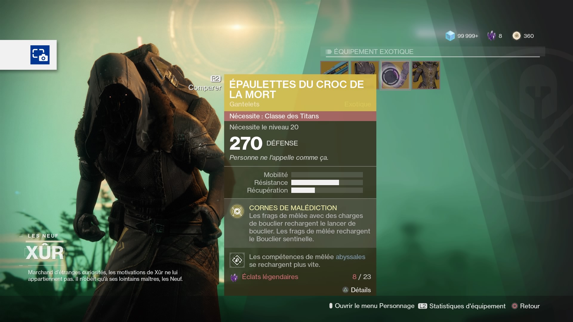Tous les vendredis matins, nous vous indiquons où se situe le vendeur Xûr et nous vous détaillons ce qu’il propose à vendre. A rappeler que le vendeur n’est présent qu’entre le vendredi 11h heure française (5h du matin heure québécoise) et le dimanche 11h heure française (5h heure québécoise) donc dépêchez vous de faire vos achats. Ceux-ci se font à l’aide d’éclats légendaires, que vous pouvez gagner en faisant certaines activités hebdomadaires ou en démantelant des pièces d’armures ou armes légendaires.