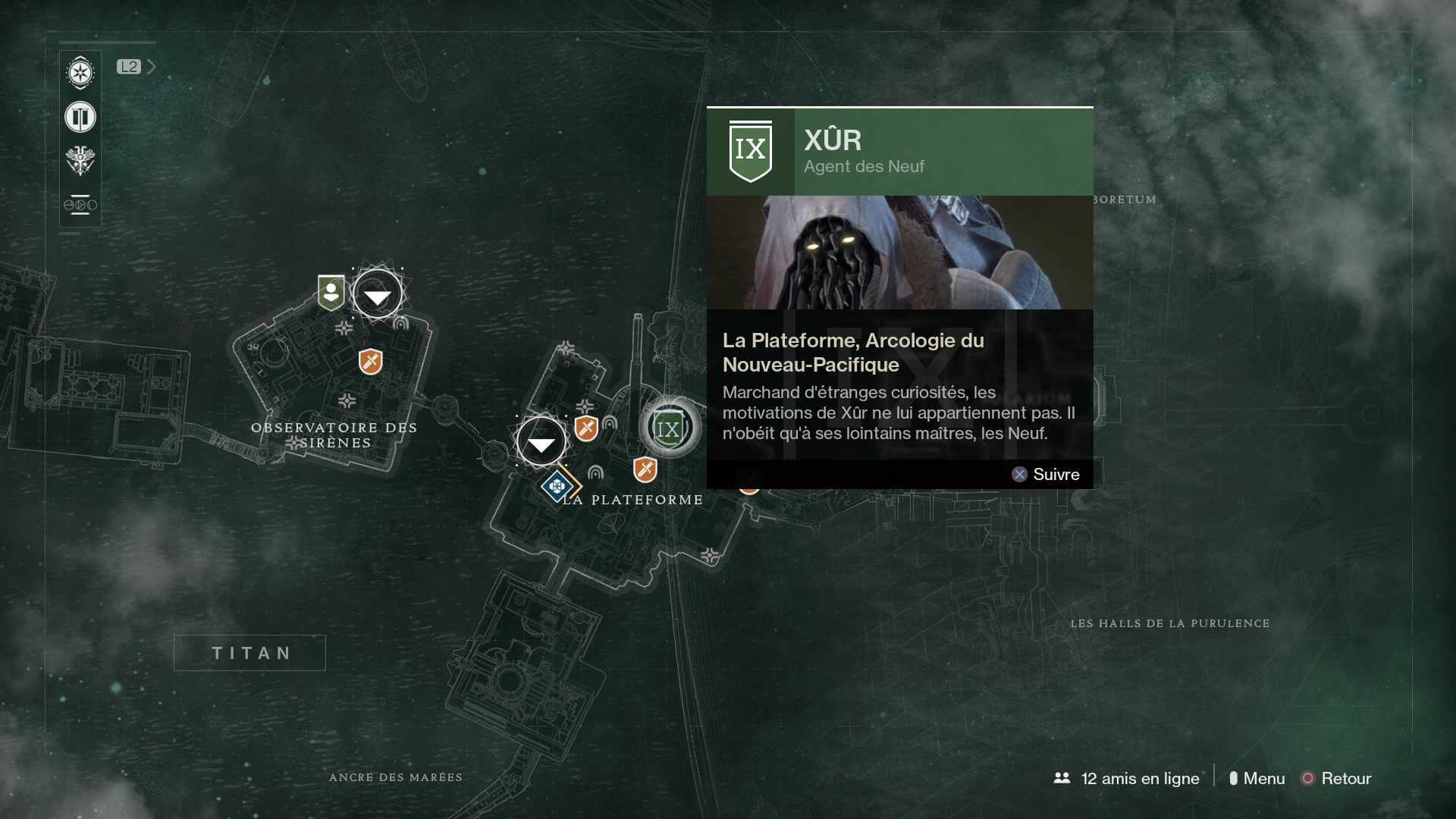 Nouveauté pour Destiny 2, ce dernier sera moins coquin dans sa discrétion puisque son emplacement sera indiqué sur votre carte. Pour ce week-end du 22 septembre 2017, Xûr se situe dans la section du milieu sur Titan :