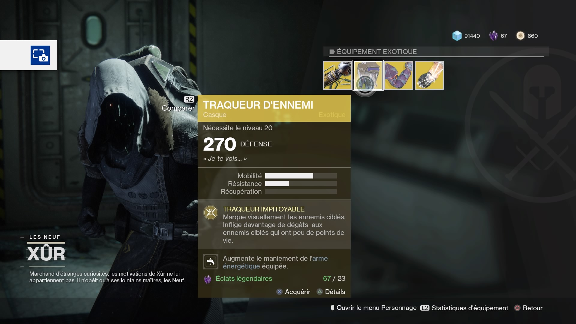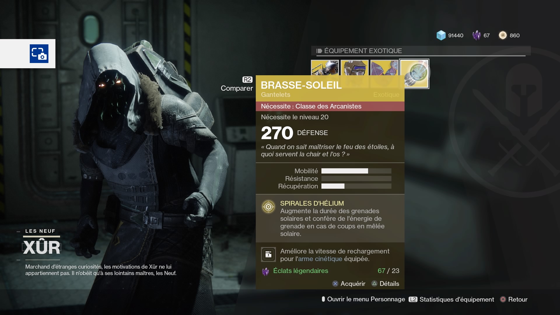 Tous les vendredis matins, nous vous indiquons où se situe le vendeur Xûr et nous vous détaillons ce qu’il propose à vendre. A rappeler que le vendeur n’est présent qu’entre le vendredi 11h heure française (5h du matin heure québécoise) et le dimanche 11h heure française (5h heure québécoise) donc dépêchez vous de faire vos achats. Ceux-ci se font à l’aide d’éclats légendaires, que vous pouvez gagner en faisant certaines activités hebdomadaires ou en démantelant des pièces d’armures ou armes légendaires. Vous trouverez d’ailleurs de d’information à ce propos dans notre test de Destiny 2.