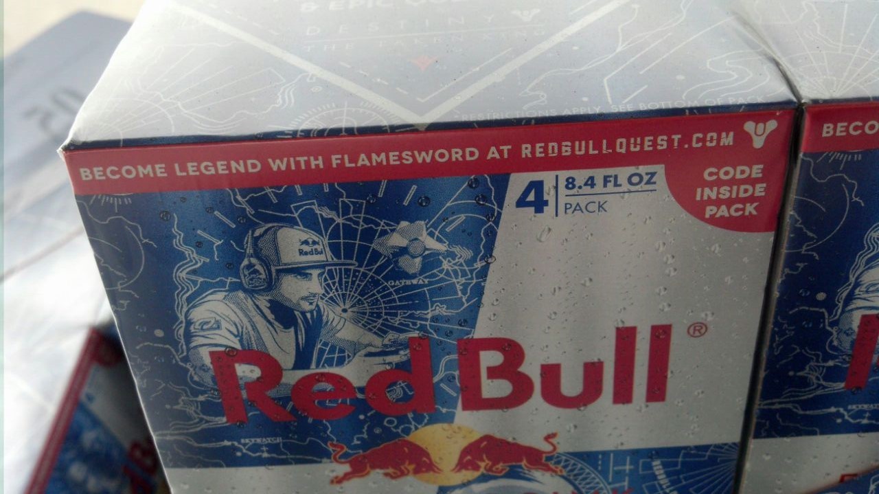 Alors que La Maison des Loups est déjà sortie depuis deux semaines et que beaucoup de joueurs ont repris gout au jeu, une nouvelle fuite a renforcé la rumeur quasi-officielle du nom de la prochaine extension « The Taken King« . En effet, un internaute a pris en photo un emballage de canettes Red Bull américaines où l’on peut lire « Become Legend with Flamesword at redbullquest.com » avec à côté un dessin de Flamesword, un Youtuber célèbre en train de jouer (à Destiny surement) accompagné d’un spectre. De plus, juste en dessous on peut lire « Redeem code for bonus xp & epic quest in Destiny : The Taken King« .