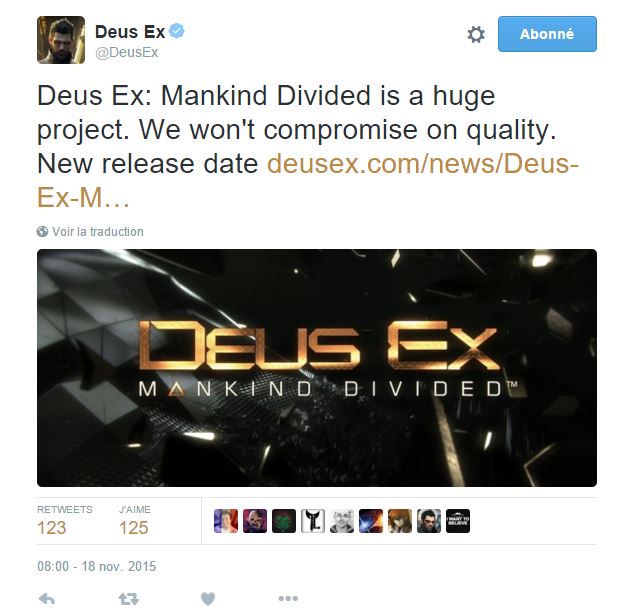 Comme vous avez pu le remarquer en lisant les nombreux aperçus sur Deus Ex Mankind Divided, nous voulons en faire le digne successeur de Deus Ex Human Revolution. Nous savons que les attentes sont très élevées et nous ne voulons pas nous contenter de les satisfaire, nous voulons les dépasser. Nous sommes fier et confiants sur notre titre, mais, en testant le jeu dans son ensemble, nous avons remarqué que nous avons besoin de plus de temps en post-production pour atteindre la qualité désirée en affinant tous les aspects du jeu. Afin d’atteindre cet objectif, nous sommes contraints de reporter la sortie de Deus Ex Mankind Divided au 23 août 2016. Nous sommes désolés si cette nouvelle vous déçoit, et nous vous remercions de votre soutien et votre compréhension. Ce jeu fait partie de nos vies et nous ne voulons rien concéder quant à sa qualité. Merci d’être patient avec nous un peu plus longtemps. C’est une énorme responsabilité et un énorme privilège de travailler sur cette série et nous voulons vous offrir la meilleure expérience possible.