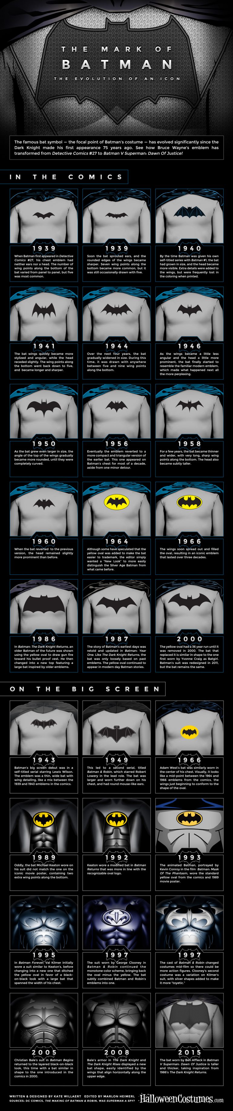 À cette occasion, voici une infographie réalisée par Kate Willaert avec le site HalloweenCostumes qui revient sur l’évolution du symbole de Batman sur son torse et son costume : la fameuse chauve-souris. Des premières modèles en 1939 jusqu’à celuis que portera Ben Affleck dans Batman V Superman : Dawn of Justice en 2016, on retrouve trouver les symboles aperçus à la fois dans les comics mais également au cinéma.