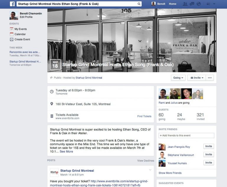 La partie centrale se divise toujours en deux colonnes mais avec un équilibre différent. La colonne de gauche rassemble maintenant les informations sur l’événement (date précise, horaire, adresse et carte si disponible, achat de tickets), sa présentation générales ainsi que les messages et statuts de l’espace. Les réponses prennent maintenant place à droite avec une présentation plus visuelle des réponses de ses amis et les chiffres généraux concernant les réponses. Dans cette même colonne, on retrouve la possibilité d’invités ses amis, des événements suggérés et une partie publicitaire. Ce dernier aspect n’était pas présent sur la précédente version mais montre que Facebook veut renforcer sa monétisation sur tous les espaces.