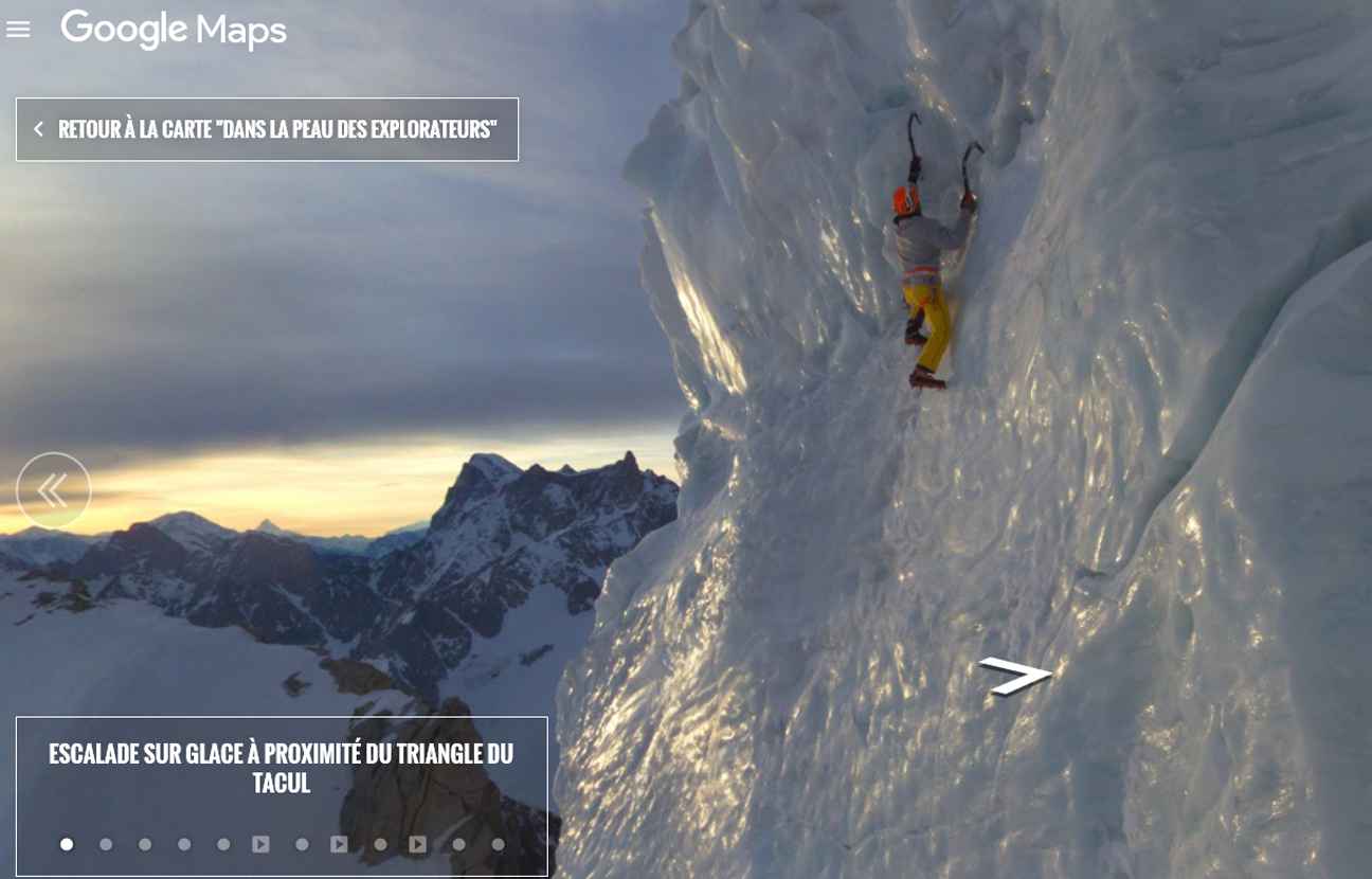 La carte interactive permet d’explorer le Massif du Mont Blanc, de la vallée de Chamonix, en passant par la Route du Goûter, la Mer de Glace tout en ayant le point de vue des 6 athlètes. Des visites au format Street View sont proposées, des photos panoramiques et des vidéos à 360 degrés achèvent cette immersion proposée par Google. Tout au long de cette expérience, vous pouvez entendre les différents témoignages des athlètes afin de bien comprendre le Mont-Blanc, mais également cette passion peu commune.