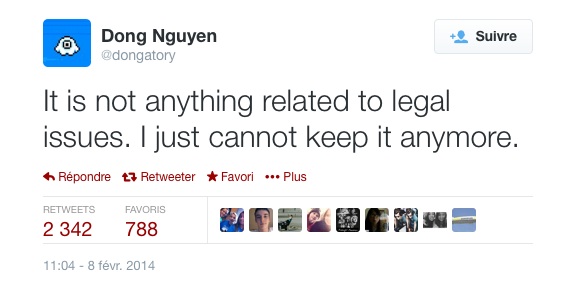Si aucune raison précise n’est donnée, Dong Nguyen explique que des problèmes légaux ne sont pas responsables du retrait du jeu, pas même un possible rachat du concept. Le créateur a aussi profité de l’occasion pour annoncer qu’il continuera le développement de jeux vidéo.
