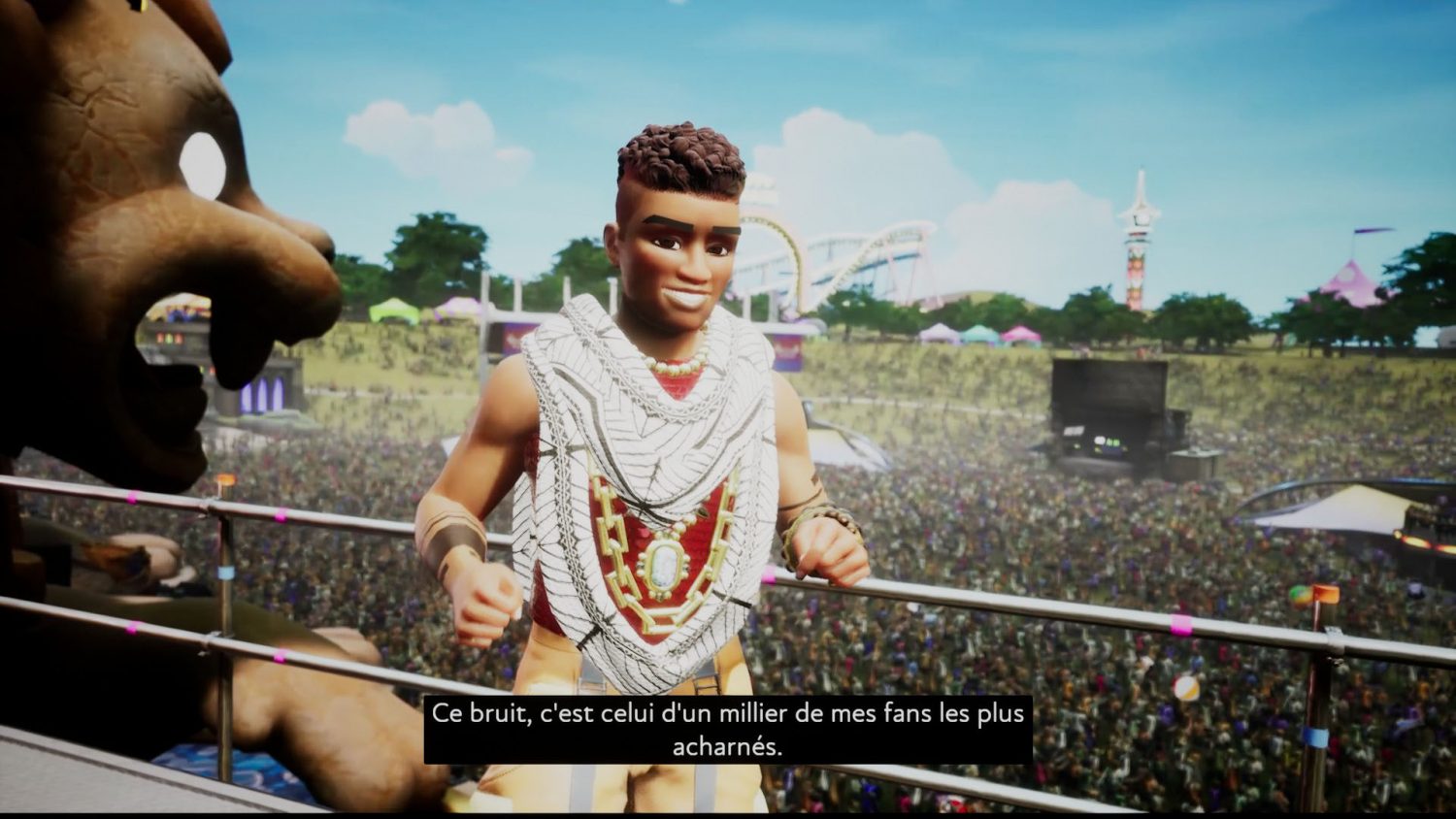 Fuser propose aux joueurs de devenir l’un des meilleurs DJ et de participer aux plus grands festivals du monde entier. Le mode carrière que propose le studio Harmonix permet de grimper peu à peu les échelons en débutant avec des performances en plein milieu de l’après-midi pour ensuite accéder à la tête d’affiche en pleine nuit. Les développeurs ajoutent peu à peu des fonctionnalités tout au long de votre progression afin d’apprendre tout en s’amusant sans pour autant être lâché sans aucune explication. Néanmoins, j’ai quelque réserve concernant le scénario. En effet, le titre intègre des cinématiques avec souvent de drôle de dialogue. Les animations des personnages sont parfois un peu trop intenses pour le propos en tant que tel. Selon moi, il n’était pas nécessaire de proposer des cinématiques. De simples voix-off auraient été largement suffisantes.