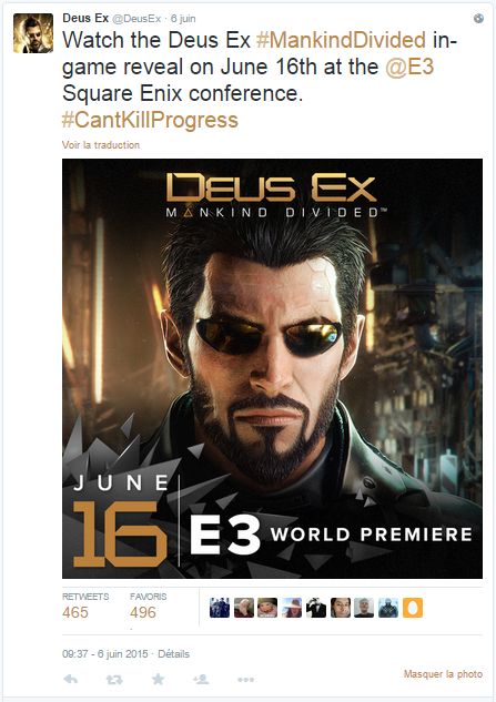 Officiellement annoncé après un long teasing sur Twitch par Square Enix le 8 avril dernier, Deus Ex : Mankind Divided va comme prévu en montrer un peu plus à l’E3, après avoir diffusé une bande annonce de gameplay lors de la conférence Square Enix, le 16 juin à 19h heure française et 13h pour le Québec.