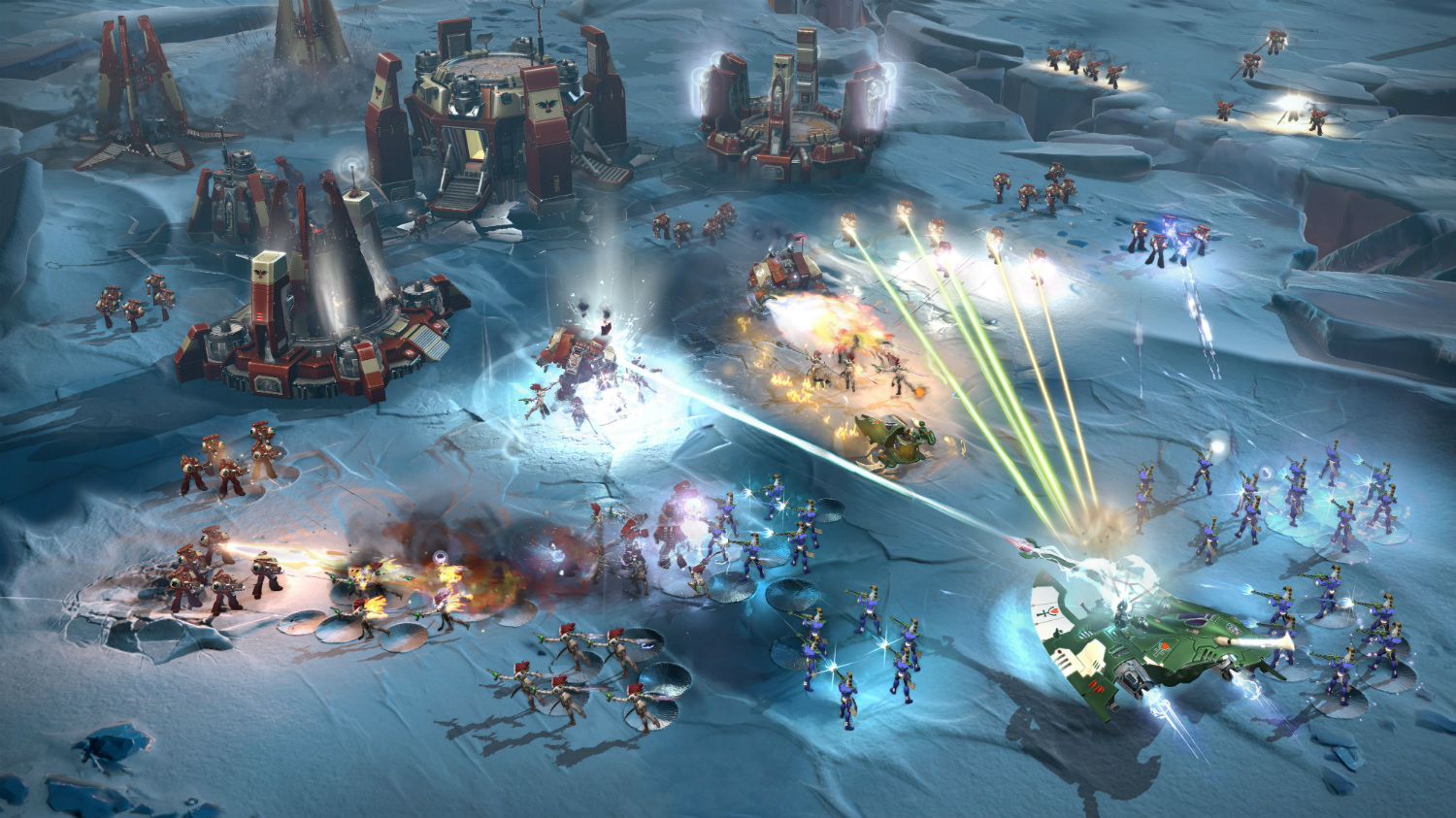 Dans la démo que nous avons pu prendre en main pendant environ 1h, nous incarnons les Space Marines, menés par le commandant des Blood Raven, Gabriel Angelos et le Chevalier Impérial Solaria sur une planète hostile (en même temps, on est dans l’univers de Warhammer 40K). Votre mission : repousser les attaquants Eldars et détruire leur portails de téléportation pour éviter d’être pris en tenaille. Vous commencez donc avec quelques unités, vos héros, et les principaux bâtiments d’une base classique. Le reste est très classique si vous avez joué à Dawn of War une fois dans votre vie. L’accumulation de ressources se fait simplement via le contrôle de quelques points stratégiques de la carte, ce qui oblige, en cohérence avec l’univers de Games Workshop, à une stratégie très nerveuse et agressive. Celui qui contrôle le plus de points et les tient longtemps aura plus de ressources que ses adversaires, et donc plus de troupes. Une mécanique qui peut sembler simpliste par rapport à d’autres RTS mais qui permet de se concentrer sur la microgestion de vos armées tout en obligeant à être sur le qui-vive en permanence pour protéger les quelques points stratégiques de la map.