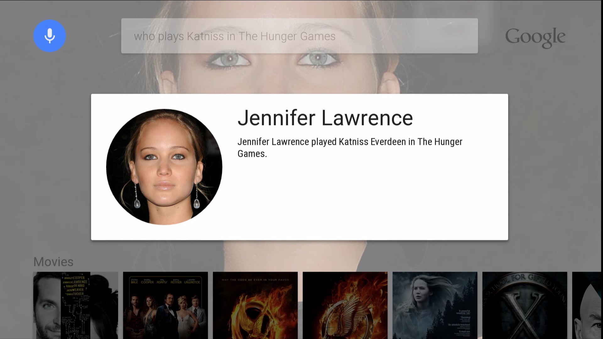 Avec le Graph Search de Google, il est possible de faire des recherches très poussées et contextualisées. Par exemple, il a été montré qu’on pouvait chercher: « Quels ont été les nominés aux Oscars de 2002? » ou « Qui joue le rôle de Katniss dans Hunger Games? ». Les résultats sont présentés simplement avec un visuel très attrayant pour le grand écran.