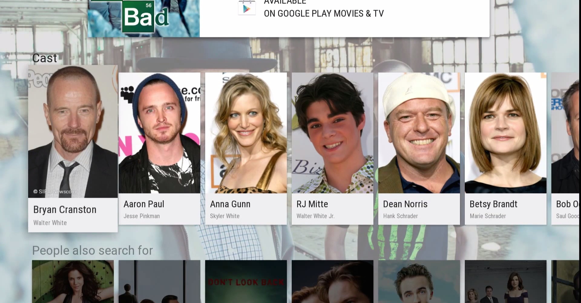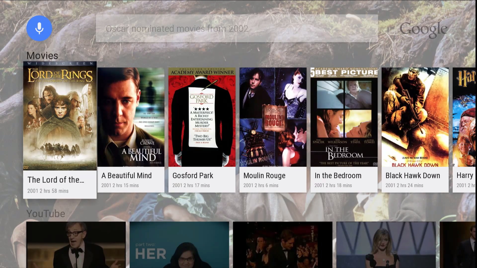 Lorsqu’on fait des recherches sur Android TV, les résultats sont présentés de façon à mettre le contenu au premier plan. Avec la possibilité d’indexation du contenu applicatif, les résultats concerneront toutes applications installées sur le produit. Par exemple, si on recherche un film et qu’il est disponible sur Netflix, Google Play et Crackle, l’usager pourra choisir avec quel service ou application accéder au contenu.
