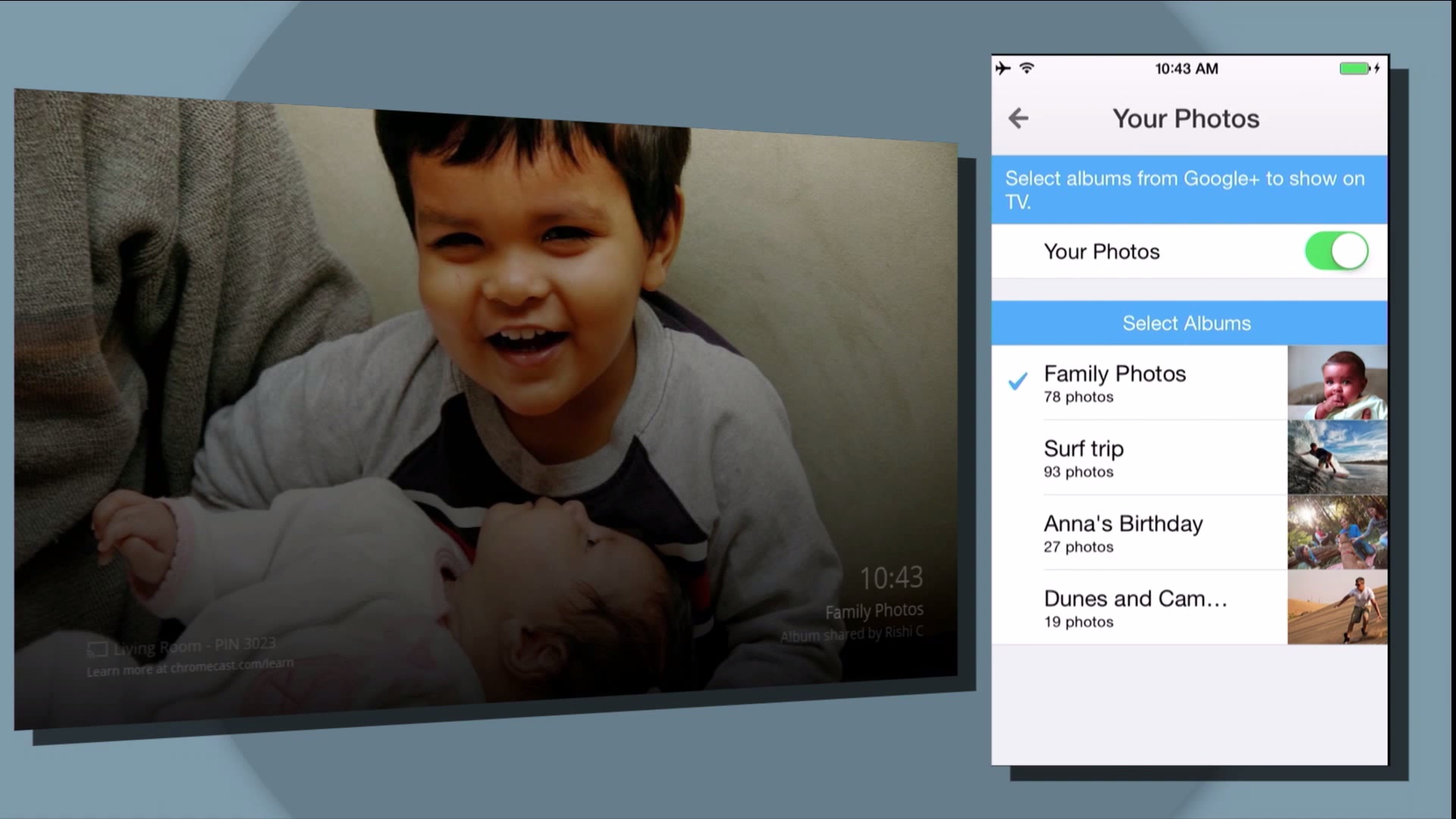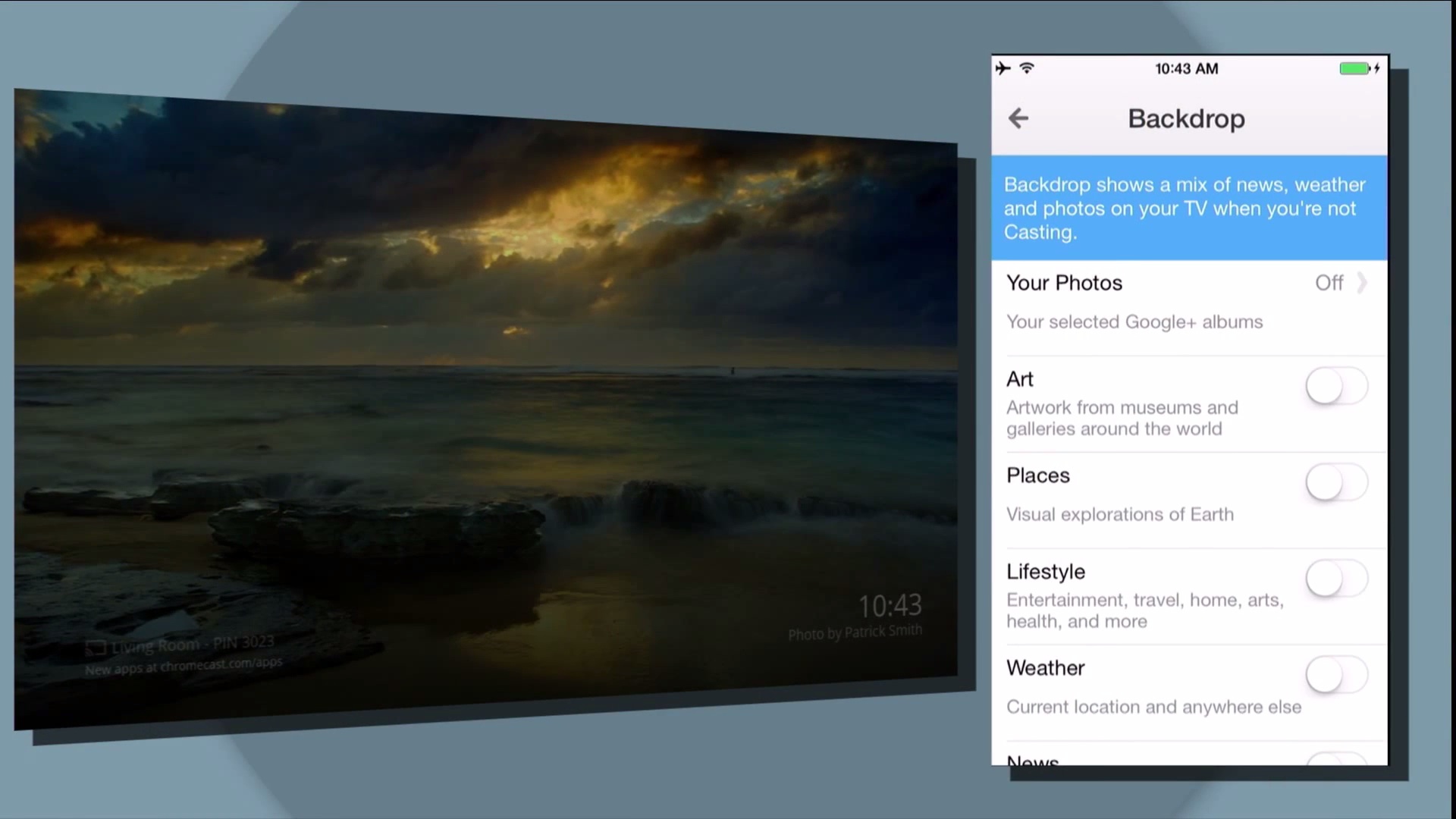 Backdrop est une application qui transforme un Chromecast en cadre numérique personnalisable. Google offre des canaux avec curation qui affichent des œuvres d’art, des images satellite et autres. Il sera aussi possible d’afficher sa propre sélection de photos parmi nos bibliothèques d’images.