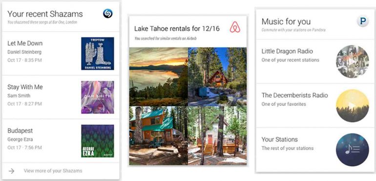 En effet, Google vient d’annoncer que les applications tierces pourront maintenant afficher du contenu dans Google Now. Au total ce sont plus de 40 applications qui seront compatibles au lancement incluant Hootsuite, Airbnb, Pandora, Shazam, Lyft, Waze ou eBay notamment. Elles pourront ainsi afficher dans Google Now des informations comme des recommandations de musique ou de logements pour votre prochain voyage, la fin de vos enchères ou même démarrer votre véhicule à distance.