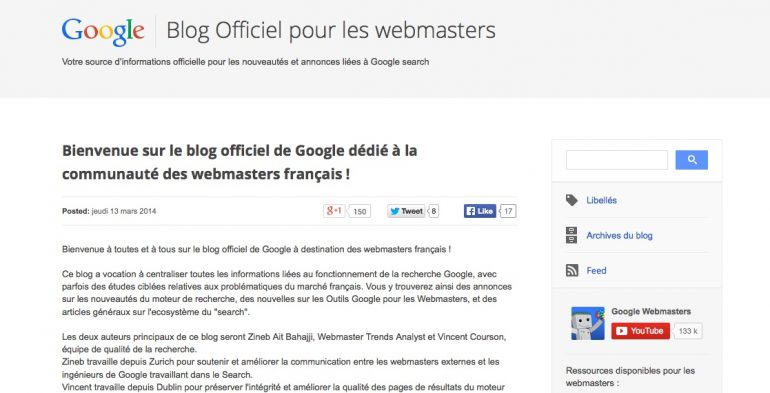 Google a annoncé la semaine dernière, l’ouverture d’un nouveau blog en français qui regroupera des informations pour les webmasters en lien avec le fonctionnement de la recherche. Ainsi, on pourra y retrouver « les nouveautés sur le moteur de recherche, des nouvelles sur les Outils Google pour les Webmasters, et des articles généraux sur l’ecosystème du search ».