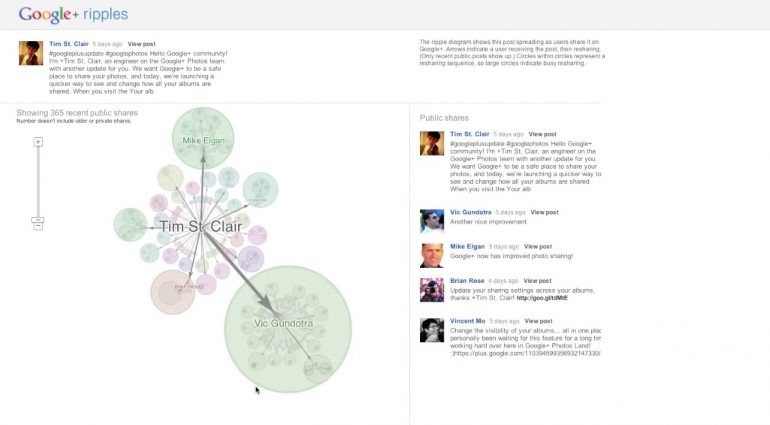 La fonctionnalité Écho / Ripples avait été ajoutée sur Google + lors d’une mise à jour en octobre 2011. Il s’agit d’un outil de visualisation qui permettait de voir de quelle manière son post était partagé sur le réseau social. Ainsi, il était possible de voir le nombre de personnes qu’un post a touché, de quelle manière cela a évolué dans le temps et de facilement identifier les personnes qui ont joué un rôle important dans la propagation de ce post.