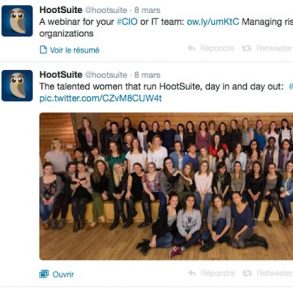 Par ailleurs, on note que les éléments affichés sont plus aérés qu’auparavant. Par ailleurs, les messages intègrent maintenant directement des vignettes des médias que cela soit des images sur Twitter, des images sur Facebook, des images de liens sur Facebook… Dans le cas de Twitter, il est possible d’afficher en plus grand les images dans Hootsuite.