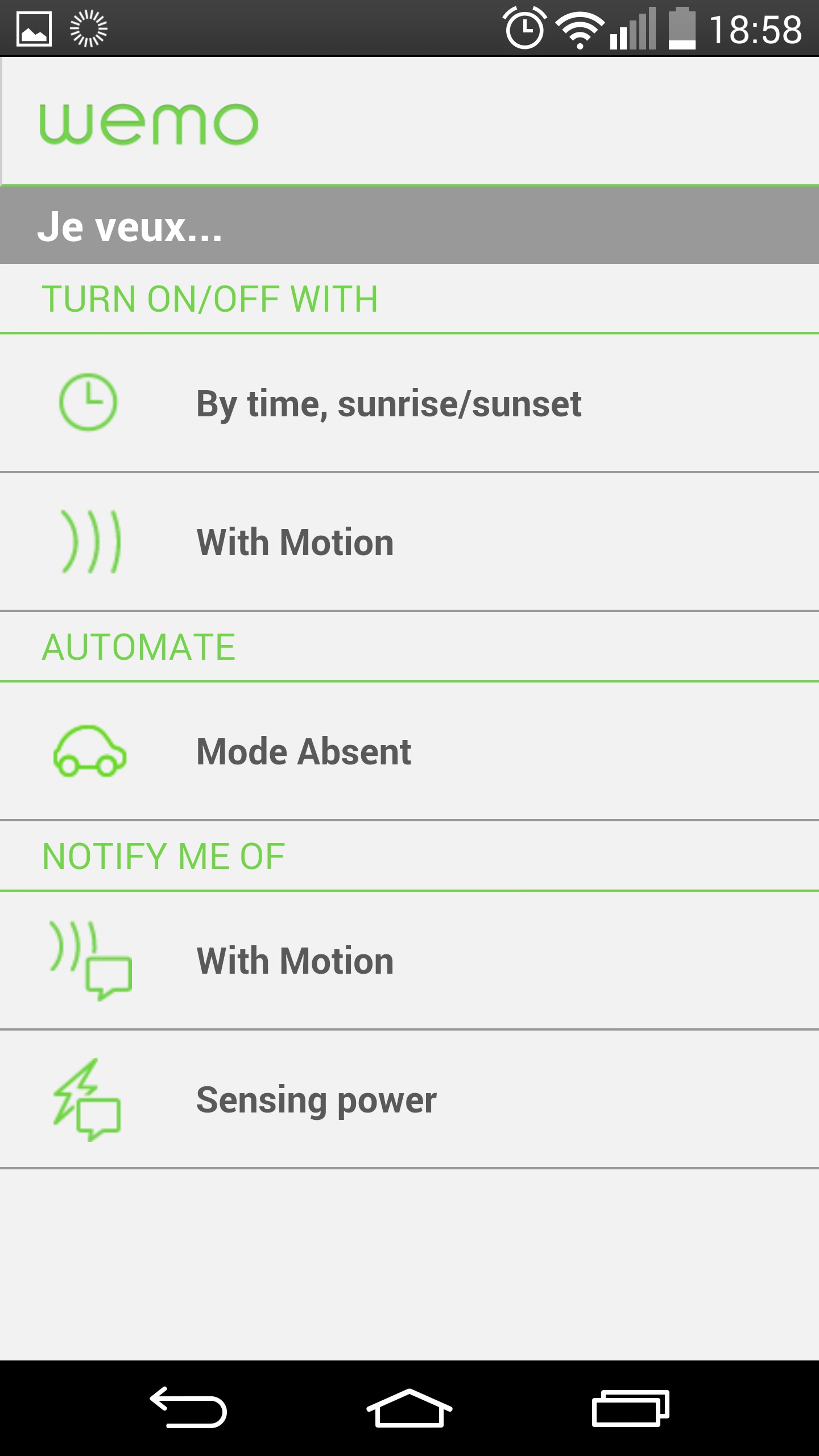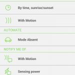 L’application WeMo permet également de créer des règles, selon différents types de déclencheurs. Il est par exemple possible d’effectuer une action de manière programmée dans le temps, ou lorsqu’un mouvement est détecté, si l’on dispose de la NetCam ou d’un WeMo Motion. Au niveau des actions réalisables, on peut déclencher une action on/off sur une prise ou une ampoule, ou encore recevoir une notification sur son téléphone mobile pour nous prévenir que le critère de la règle a été rencontré (les enfants sont rentrés à la maison, par exemple).