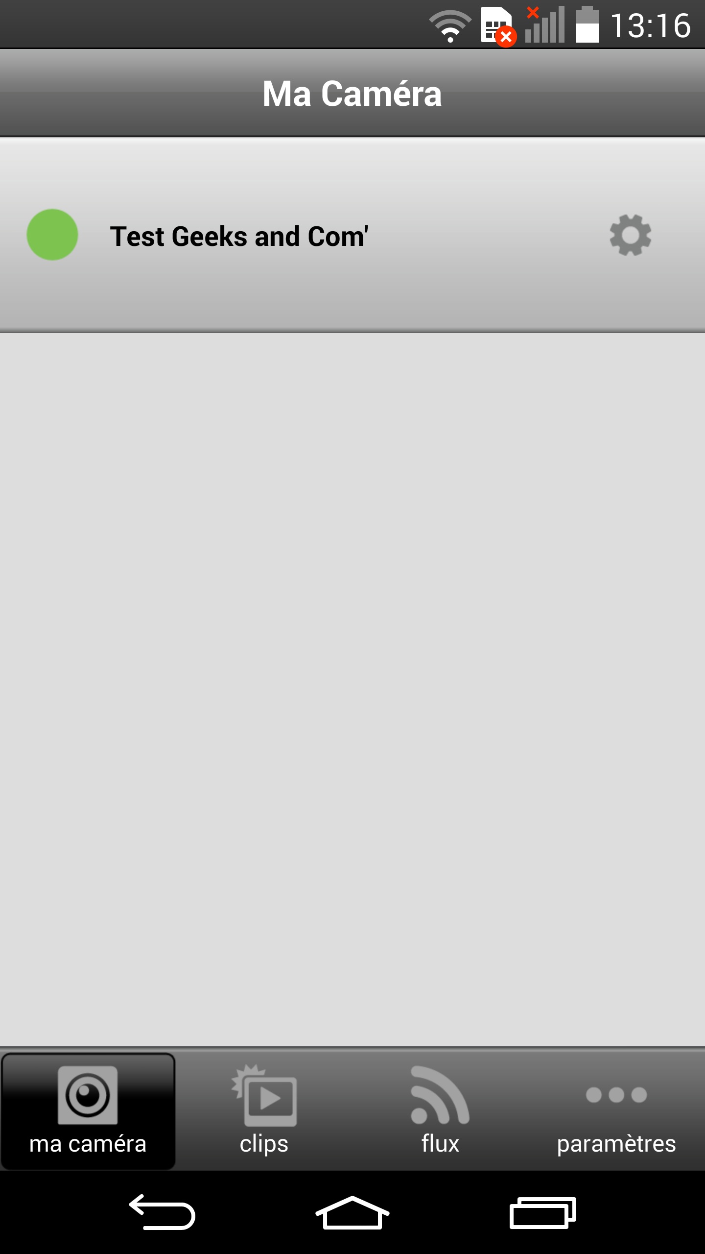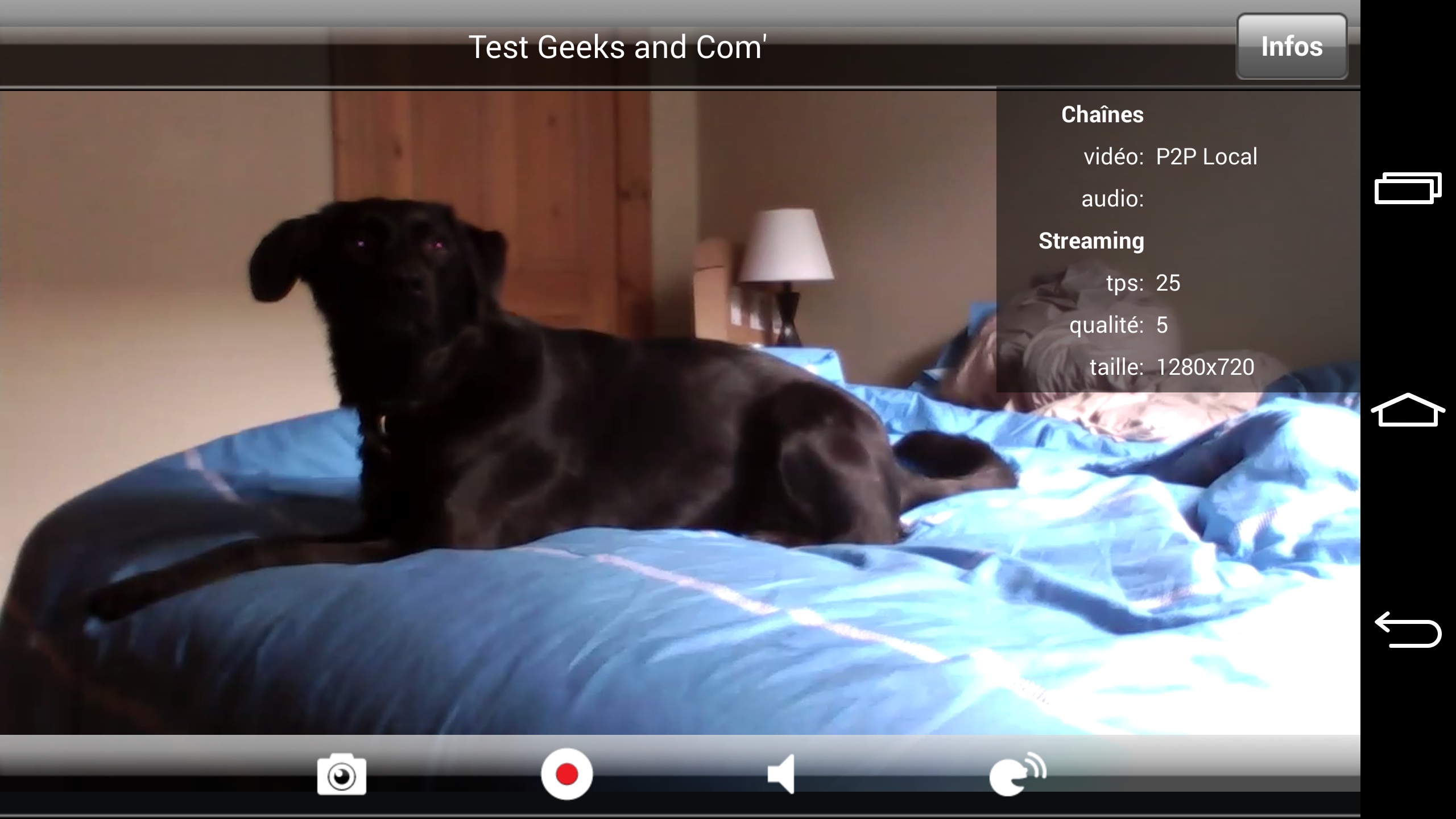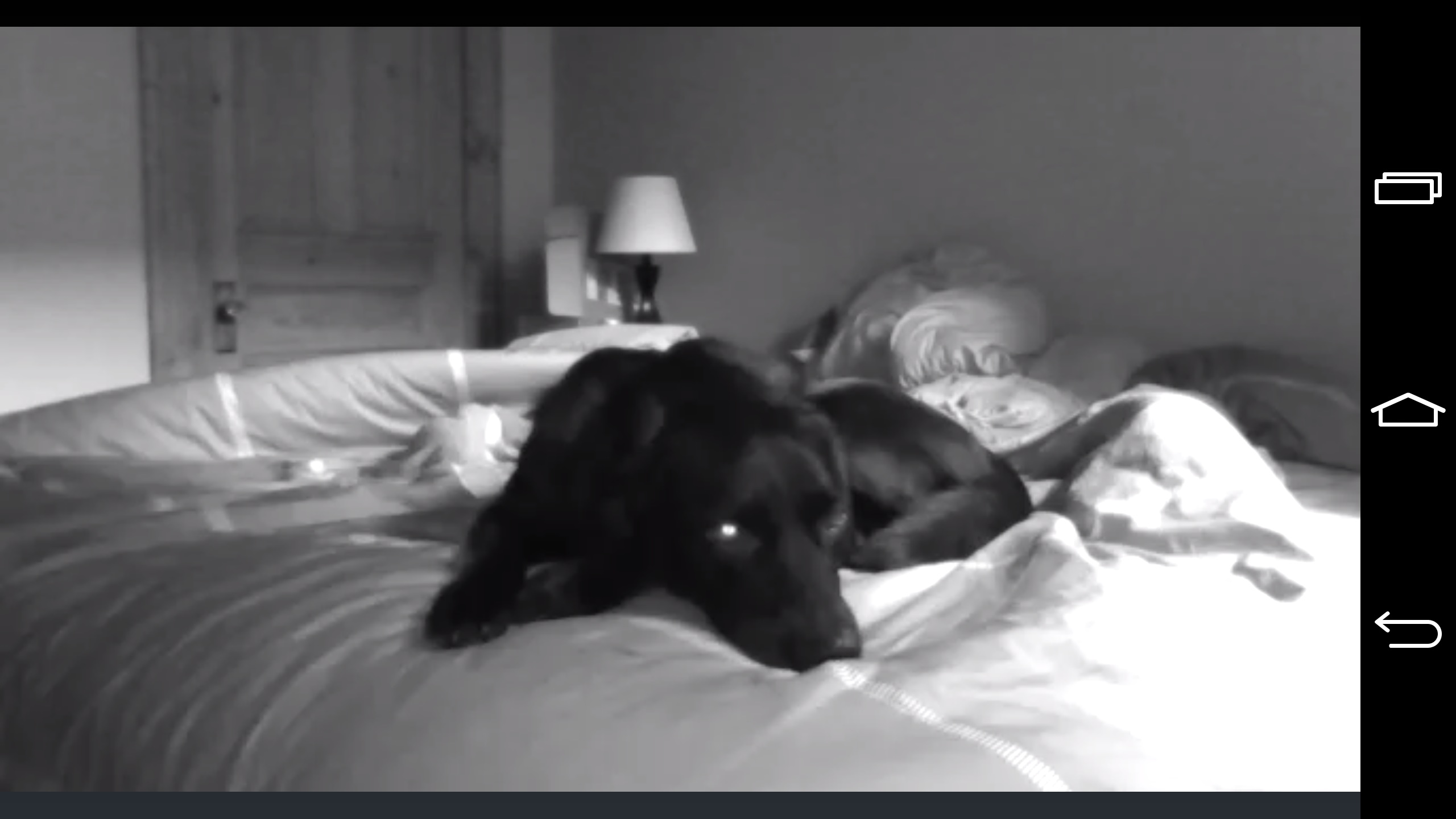 Une fois que l’on est connecté à son compte, l’application permet de voir toutes les caméras connectées. Quand on clique sur la caméra souhaitée, on voit le flux en direct en couleur lorsque la luminosité est suffisante et en noir et blanc lors de la vision nocturne. Il est alors possible d’enregistrer des séquences vidéos/images, d’écouter le son de la pièce mais aussi de parler via son téléphone.