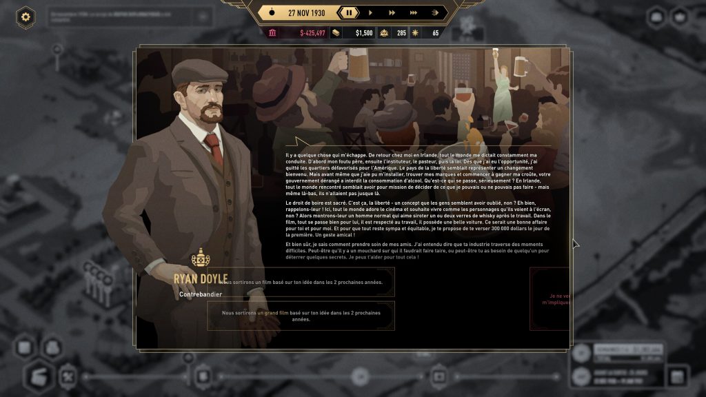 Hollywood Animal se présente comme un jeu de gestion relativement classique, mais avec une couche narrative et morale bien plus marquée que la moyenne. On y incarne un producteur à la tête d’un studio indépendant, qui doit choisir les bons projets, embaucher des talents, surveiller ses finances et séduire la presse comme les distributeurs. Il y a même la possibilité d’acquérir directement des salles de cinéma. Les mécaniques de base sont simples à appréhender : il faut produire des films, engager des réalisateurs et des acteurs, gérer les coûts et espérer un bon retour sur investissement.