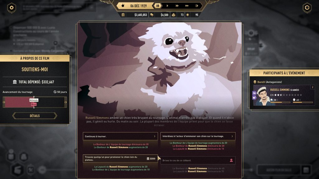 Même si Hollywood Animal propose un didacticiel plutôt complet, ce dernier vous apprendra uniquement les bases des mécaniques du jeu. Il n’est pas toujours évident de savoir sur quoi investir, ni pourquoi tel film à fonctionner alors qu’un autre, pourtant bien produit, s’est planté. Cette opacité peut être frustrante, surtout lorsqu’elle touche les aspects financiers. Cependant, les joueurs qui aiment apprendre en tâtonnant trouveront le tout immersif. On a vraiment l’impression d’être un pionnier dans une industrie instable, où les règles s’écrivent au fur et à mesure. Il aurait fallu proposer un juste milieu ou encore des modifications dans les paramètres pour satisfaire tout le monde.