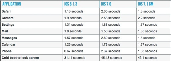 Probablement la chose qui a été le plus travaillée par Apple est la stabilité et les performances des appareils. En premier lieu, les utilisateurs d’appareils iOS 64-bit (iPhone 5s, iPad Air et iPad Mini Retina) ne sont plus victimes des crash que l’OS pouvait avoir par moments, alors que leur appareil pouvait se redémarrer de lui-même à tout moment. C’est peut-être la chose que tout le monde voulait voir corrigée et Apple ne s’est pas arrêtée là. Étant presque âgé de 4 ans, l’iPhone 4 avait énormément de difficultés à cacher son âge depuis iOS 7 mais l’arrivée de iOS 7.1 aide vraiment l’appareil en lui offrant un regain de performances assez important. L’équipe de Ars Technica s’est acquittée de la tâche de faire un comparatif au niveau des performances entre les trois dernières versions majeures de iOS pour iPhone 4 (la 7.1 GM représente la version publique de iOS 7.1).