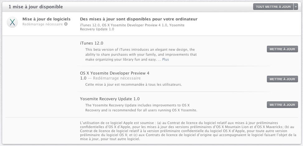 Apportant plusieurs correctifs de bugs ainsi que de nouvelles fonctions dans les deux systèmes d’exploitation, nous pouvons constater une bonne évolution dans le développement des logiciels d’Apple. Une nouveauté inattendue concerne la première beta d’iTunes 12 pour OS X Yosemite, incluse dans la Developer Preview 4. La nouvelle version d’iTunes possède un tout nouveau design repensé pour OS X Yosemite et diverses nouvelles fonctions comme le Partage Familial.