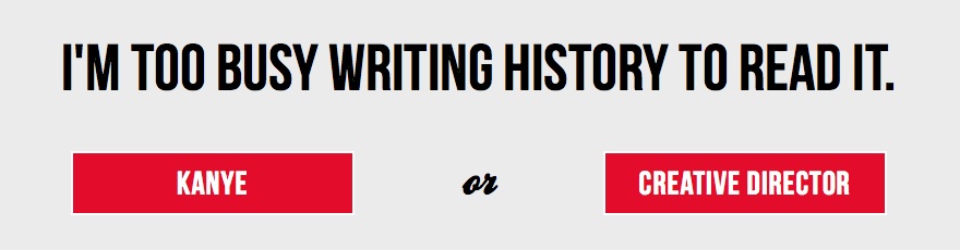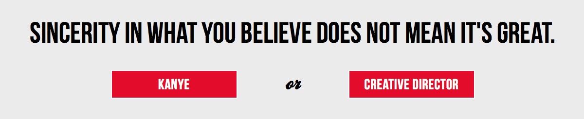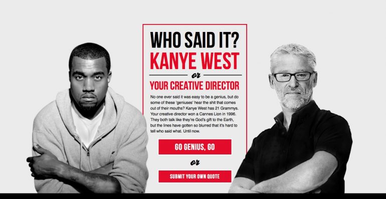 Le site kanyevscreative.com propose de trouver qui a dit certaines phrases : Kanye West ou votre Directeur de Création ? Un jeu qui amusera pas mal de monde en entreprise et en agence. C’est également une bonne occasion de faire une pause dans votre grille de Bullshit Bingo que vous veniez tout juste de commencer à remplir au milieu de votre réunion!