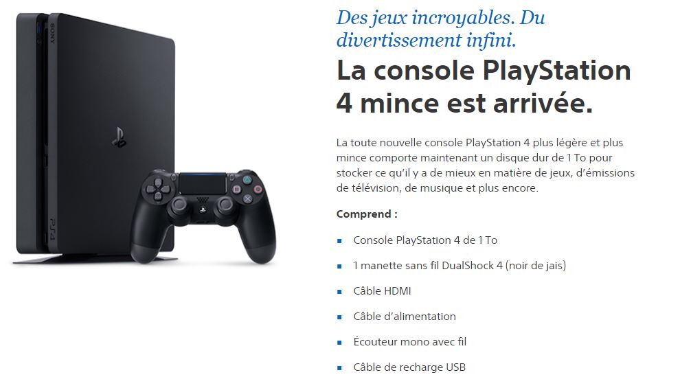 Suggéré au prix de 379,99 $ par le fabricant, le modèle inclut les mêmes éléments que son frère un peu plus grand soit la manette sans-fil DualShock 4 (noire), un câble HDMI, le câble d’alimentation, l’écouteur mono avec fil pour branchement à la manette ainsi qu’un câble de chargement USB pour cette dernière.