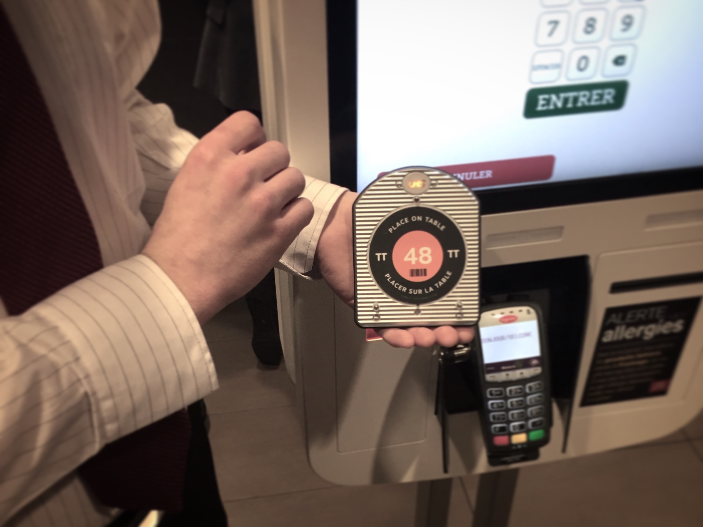 Malheureusement, je n’ai pas pu tester s’il y avait une limite au nombre d’ingrédients que l’on pouvait ajouter dans son hamburger, mais une chose est sûre, il faut être prêt à payer pour les suppléments. Toutefois, le prix d’un hamburger normal (contenant chacune des catégories d’ingrédients) semblait très raisonnable et incluait le service à la table. Un service à la table?! Effectivement, après avoir réglé ma commande à l’écran, j’ai récupéré un disque électronique pour ensuite m’asseoir à une table. Un serveur est venu me porter mon repas aussitôt prêt, non pas sur un plateau en plastique, mais dans une belle présentation comme dans les restaurants (hamburger sur planche de bois et panier à frites).