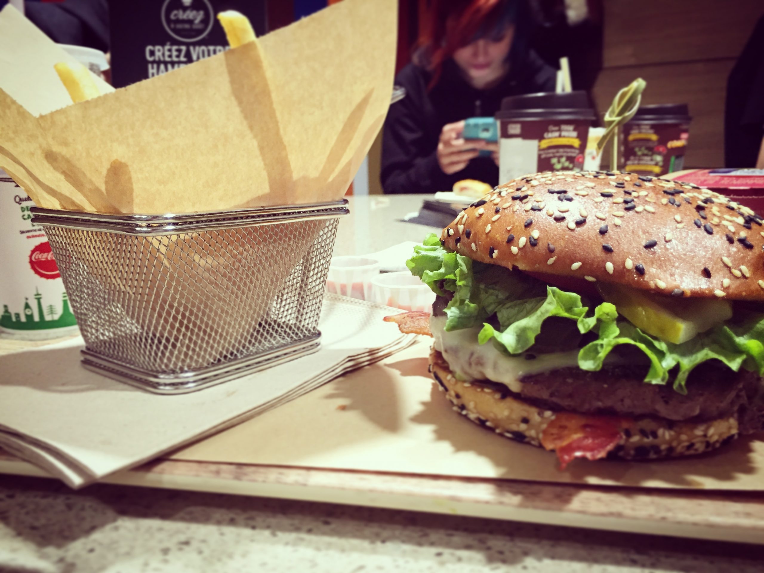 J’ai testé le nouveau service au 9375, boulevard Lacordaire, l’un des trois McDonald’s participants à Montréal, où deux bornes de commande sont présentement installées. Du choix de pain à la viande, en passant par les condiments et la sauce, j’ai pu facilement choisir tous les ingrédients sur l’écran tactile. Même qu’à un certain moment, j’ai eu le sentiment d’être dans un jeu où je devais réaliser la combinaison parfaite. On compte au total 30 ingrédients, dont 5 types de fromage, 12 garnitures, 9 sauces, deux pains et même des feuilles de laitue pour ceux qui ont une intolérance au gluten. Nous sommes loin de la douzaine de hamburgers affichés au-dessus du comptoir. À titre comparatif, si l’on multiplie la combinaison de tous ces ingrédients, nous avons le choix parmi plus de milliers de hamburgers personnalisés, sans compter les options (trio, boisson, etc.). Voici un aperçu de mon premier hamburger personnalisé (excellent soi-disant) ainsi que la borne de commande: