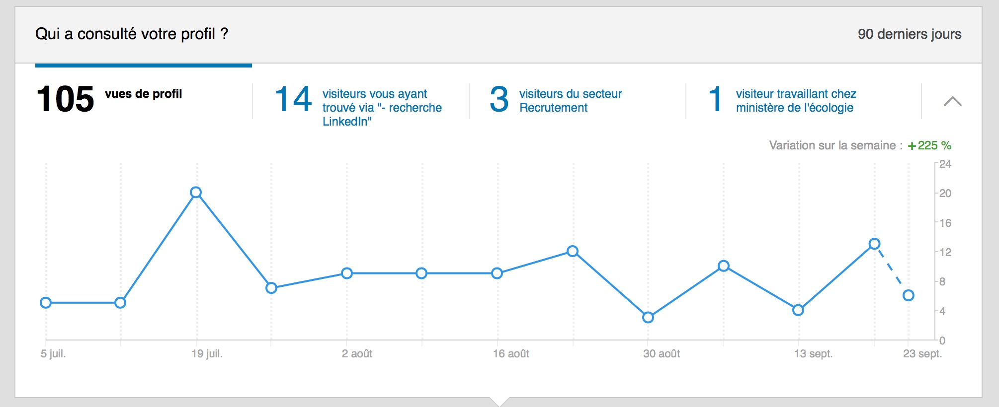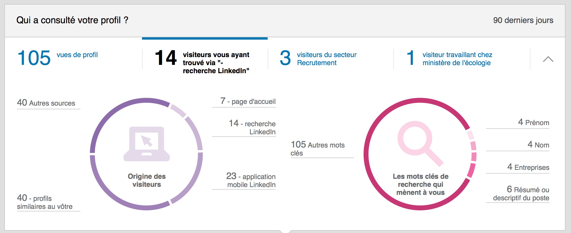 • l’endroit d’où ils venaient lorsqu’ils vous ont trouvé et les sections de votre profil qui correspondaient aux mots clés qu’ils ont utilisés dans leur recherche ;