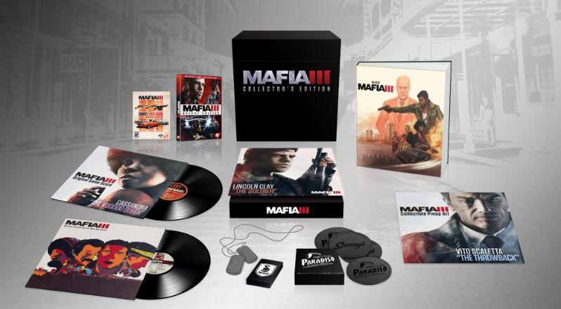 En plus du jeu, l’édition de collection de Mafia III comprend la bande sonore officielle sur vinyles, un livre d’art de plus de 50 pages, une chaîne de cou de type Dog Tag du personnage principal Lincoln Clay, des affiches exclusives du jeu, des sous-verres et la passe saisonnière. À noter que la version deluxe vendue au coût de 80 $ comprendra également la Season Pass.