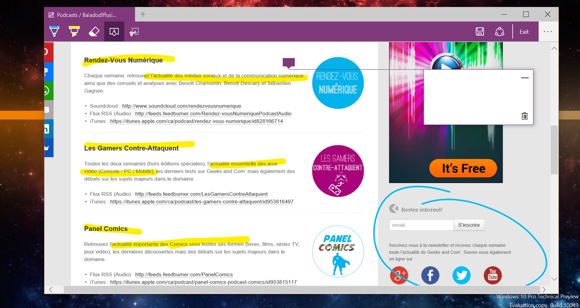 - Annotation et partage : il est possible de surligner, dessiner, découper des éléments ou écrire des notes directement sur une page Web (que cela soit en tactile ou avec un stylet). Par la suite, il est possible de partager les « Web Note » par courriel ou sur les réseaux sociaux directement. Enfin, les différentes notes peuvent être sauvegardées directement dans OneNote ;