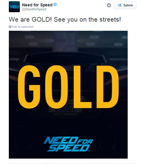 Ce midi, nous vous annoncions que Fallout 4 venait de passer gold, ce qui signifie que le développement est terminé et que les copies rentrent en fabrication. Et bien, c’est au tour de Need For Speed de partir à l’impression. La nouvelle mouture du célèbre jeu de course qui en est à son 22ème épisode, arrivera donc comme prévu sur Playstation 4 et Xbox One le 5 novembre prochain. C’est Ghost Games, via le compte Twitter officiel du jeu qui l’annonce de manière très claire comme vous pouvez le constater ci-dessous :