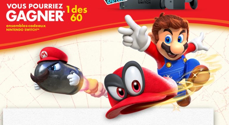 Cette promotion se déroulera du 9 octobre 2017 au 31 janvier 2018*. Pour le règlement officiel et pour plus d’informations concernant la promotion, visitez le site http://www.postconsumerbrands.ca/fr/NintendoSwitch. Pour plus d’informations à propos de la Nintendo Switch, visitez le site http://www.nintendo.com/fr_CA/switch/. Pour plus d’informations à propos de Super Mario Odyssey, visitez le site http://supermario.com/fr/.