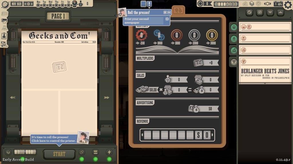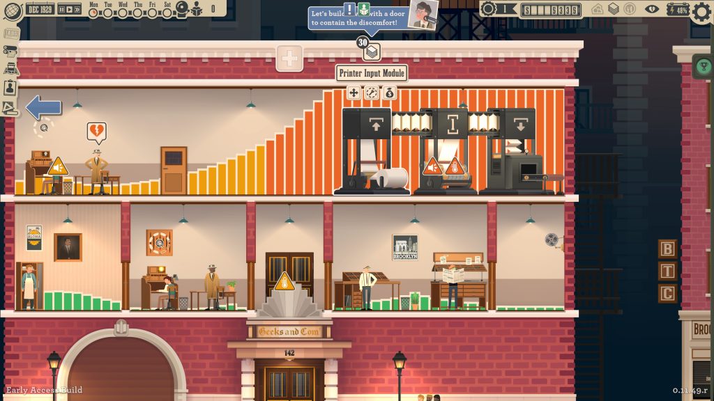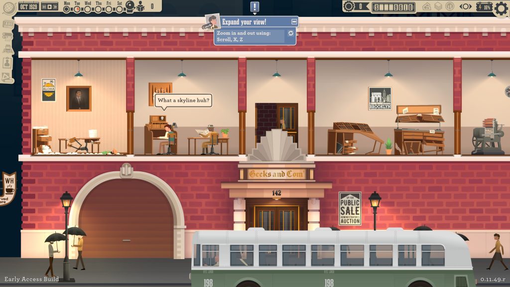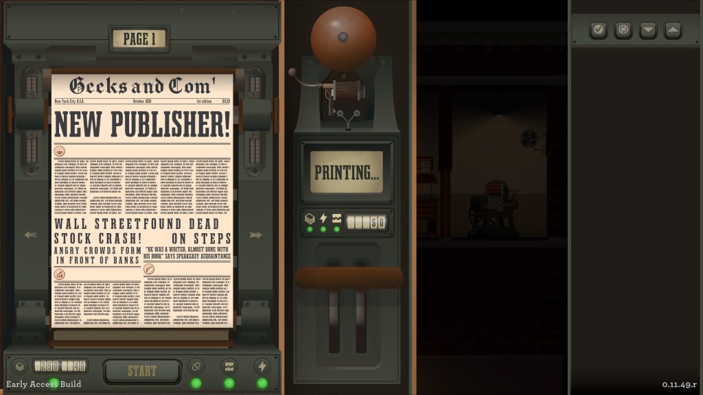 Dans News Tower, vous vous retrouvez dans la peau d’un éditeur qui reprend l’entreprise de son oncle. Au départ, vos ressources sont limitées et vous allez devoir faire le ménage d’un bâtiment pratiquement laissé à l’abandon. C’est à ce moment que l’on apprend les bases du jeu et même s’il s’agit d’un accès anticipé, on comprend rapidement qu’il y a bel et bien un aspect historique.