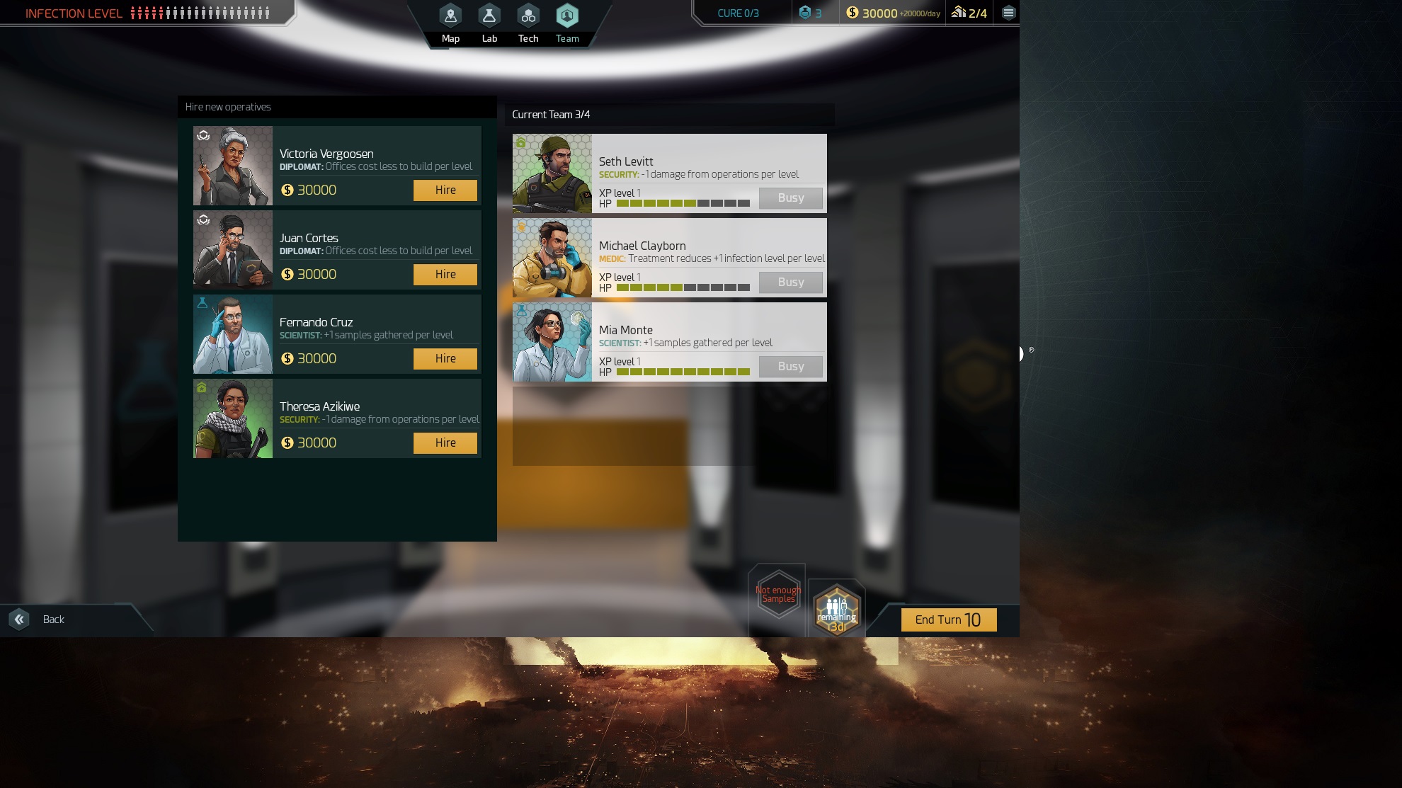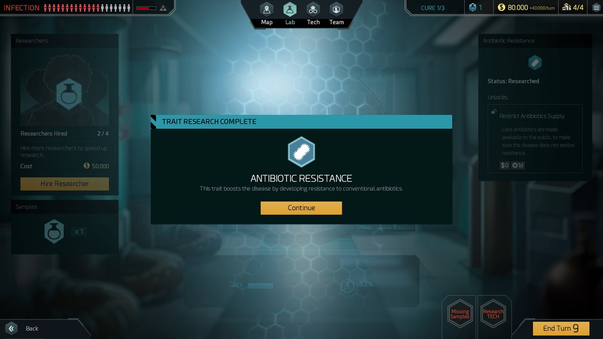Un peu comme Plague Inc. ou les autres jeux du même genre, Quarantine propose une version réaliste de la fin de l’humanité. Je vous conseille, donc, d’oublier les zombies ou encore toute autre créature issus de l’imaginaire. En effet, le titre propose des scénarios basés sur une pandémie causée soit par un virus, une bactérie ou un prion. Votre objectif est, bien entendu, celui de trouver un remède avant notre extinction et de sauver l’humanité. Pour ce faire et tel que mentionné dans l’introduction de ces impressions, le joueur peut contrôler une équipe et récolté suffisamment de donnée pour créer un vaccin.