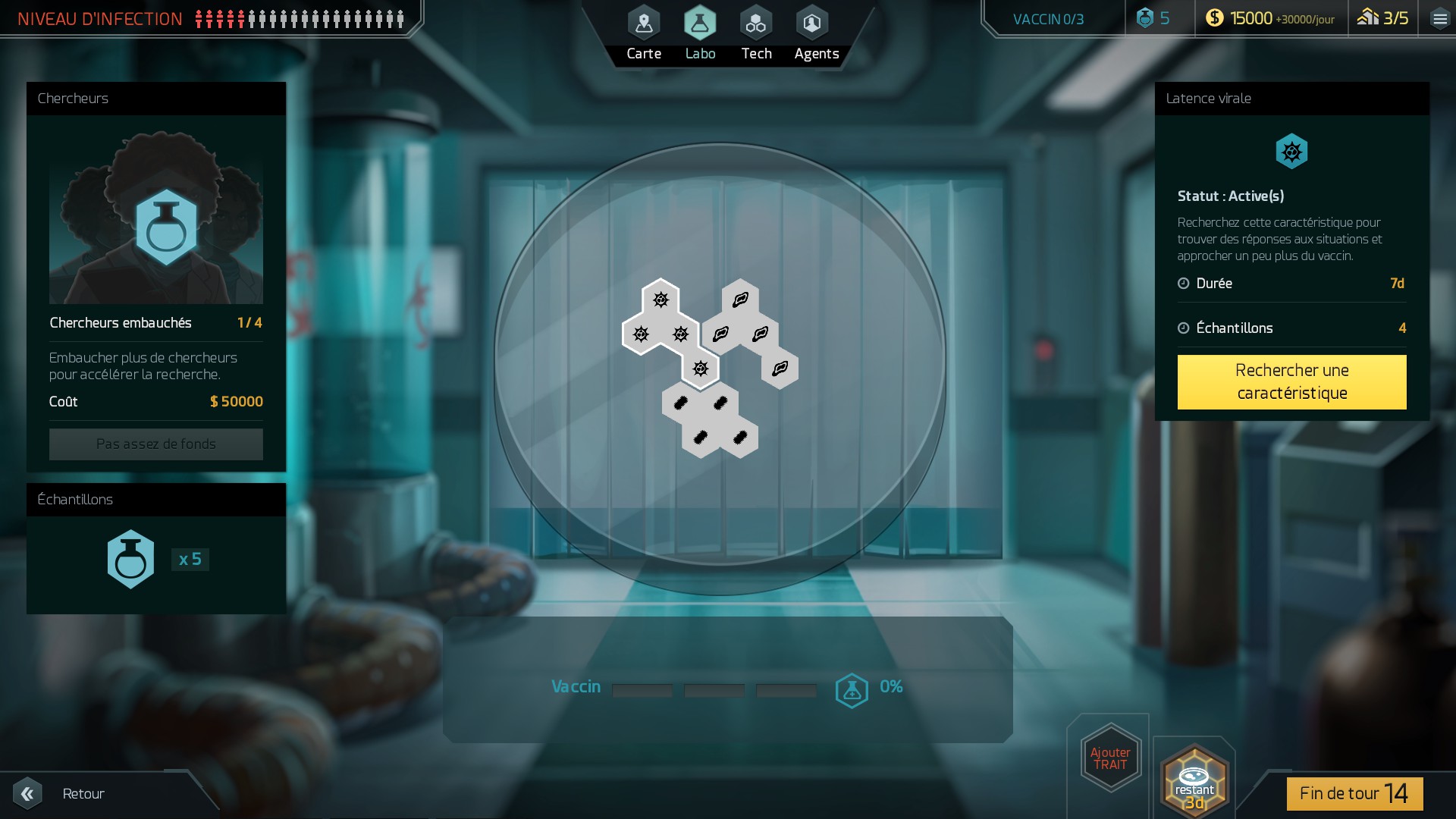 Alors vous comprendrez vite qu’il faut bien réfléchir avant d’effectuer une action. Ces dernières sont limitées et il faut noter qu’au départ, vous n’aurez qu’un seul personnage dans votre équipe. Pour augmenter le nombre de personnes pouvant combattre la maladie avec vous, vous devez utilisez l’argent amassez à chaque tour pour construire de nouveaux bureaux. Une fois vos actions effectuées, le jeu se chargera automatiquement de gérer la progression qui entraîne des conséquences plus ou moins désastreuses selon le niveau de difficulté de votre partie.